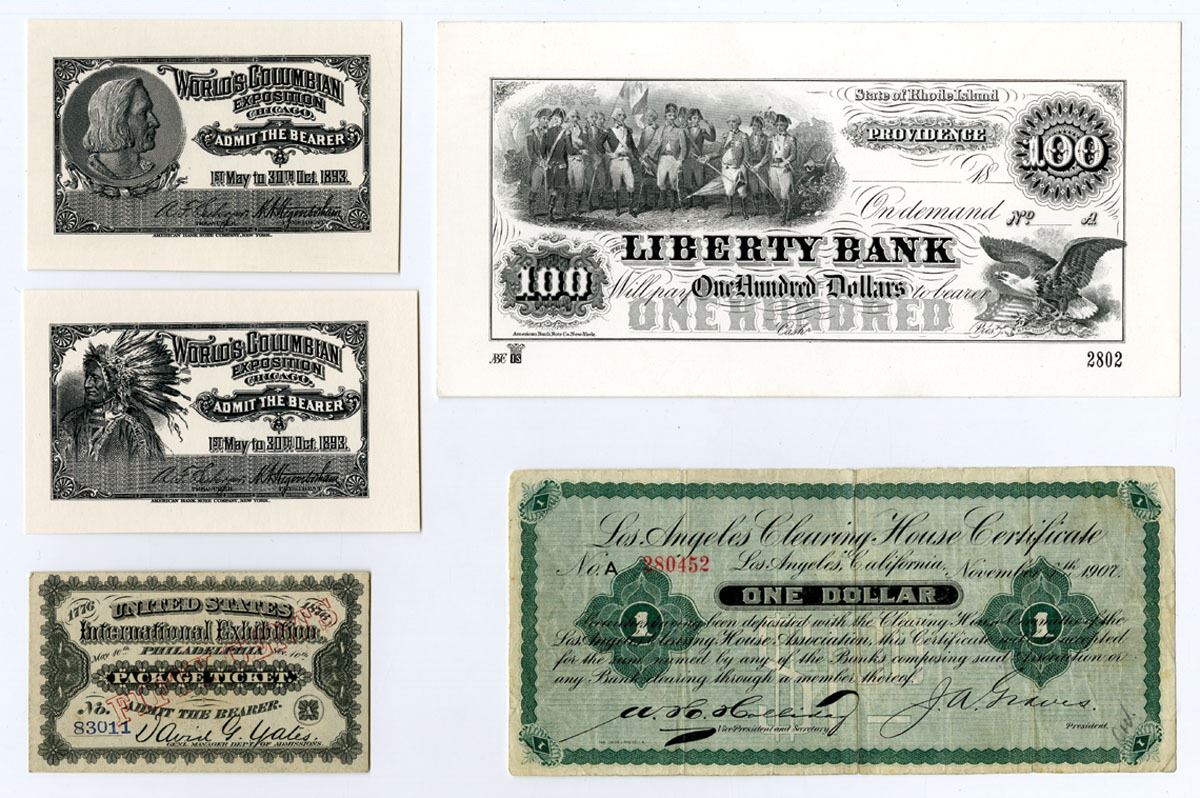California, Pennsylvania, Rhode Island, Illinois, 1876-1973. Lot of 5 Items, Includes: United States "Centennial" International Exhibition 50 Cent Package Ticket, S/N 83011, AU-Unc.; World's Columbian Expo Passes, both Proprietary Proofs, Columbus and Native American Portraits, 1893 (reprinted ca.1970-80's), both in CU condition; Los Angeles Clearing House Certificate, 1907, $1 I/U Scrip Note, S/N 280452, VF; and modern Liberty Bank $100 1973 Reprint Proof, ABNC. Documents range from VF to CU condition. (5). Sold "AS IS" no returns accepted.