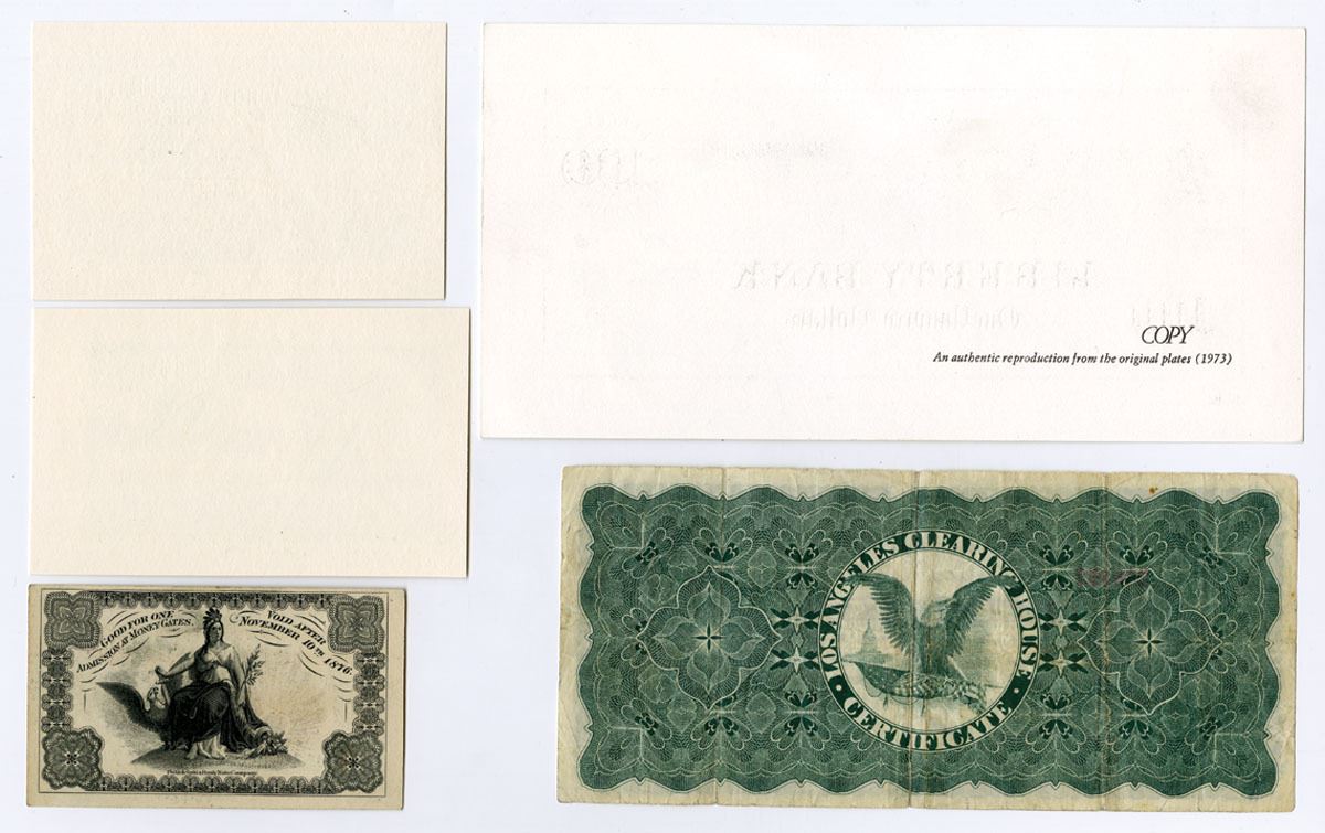California, Pennsylvania, Rhode Island, Illinois, 1876-1973. Lot of 5 Items, Includes: United States "Centennial" International Exhibition 50 Cent Package Ticket, S/N 83011, AU-Unc.; World's Columbian Expo Passes, both Proprietary Proofs, Columbus and Native American Portraits, 1893 (reprinted ca.1970-80's), both in CU condition; Los Angeles Clearing House Certificate, 1907, $1 I/U Scrip Note, S/N 280452, VF; and modern Liberty Bank $100 1973 Reprint Proof, ABNC. Documents range from VF to CU condition. (5). Sold "AS IS" no returns accepted.