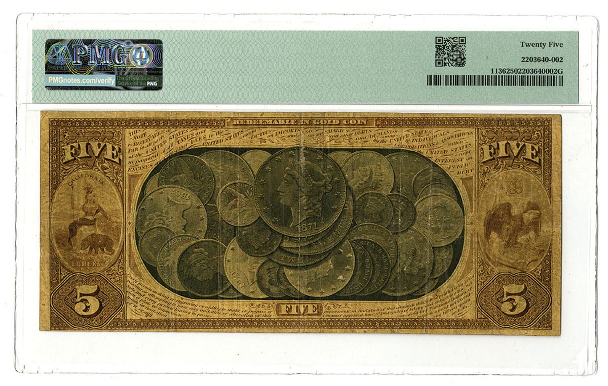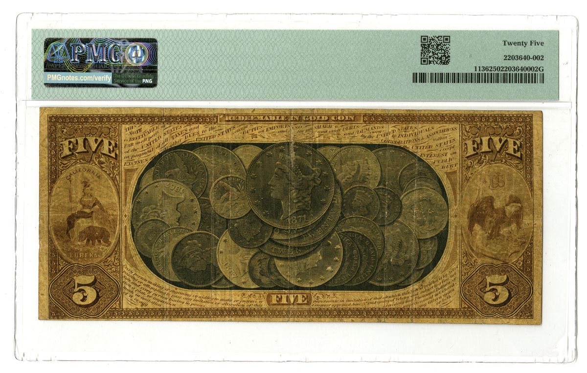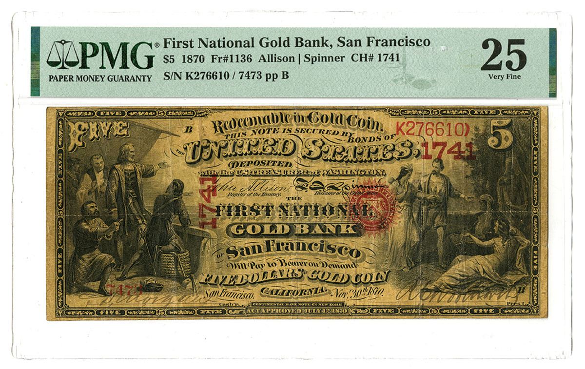 San Francisco, CA., 1870, $5, Fr#1136, Ch#1741, Issued banknote, Black on off white paper with excellent margins, Allison | Spinner signatures, S/N K276610 / 7473 pp B. This exceptional banknote, graded Very Fine 25 by PMG, remains one of the finer survivors from its era. Its vibrant coloration, and remarkable preservation set it apart from others that experienced more extensive circulation. The vignettes, including Columbus in Sight of Land and America Presented to the Old World, retain exceptional detail, with the reverse vignette, engraved by James Smillie, offering intricate depictions of individual coins that appear almost photographic in their clarity. Issued during the 1870s and early 1880s, National Gold Bank Notes like this one were introduced into a California economy that still operated on a specie-based system, where gold-backed currency was essential. However, with the resumption of specie payments across the United States in 1879, notes like this became less necessary. By 1884, most National Gold Banks had either converted to national charters or liquidated. This specimen, from the First National Gold Bank of San Francisco (Charter #1741), stands out among its peers, this piece exhibits superior eye appeal for its grade. The bold Treasury Seal and charter number, alongside signatures from officials who served between 1878 and 1882, place this note firmly within the era of California’s unique currency, making it an important relic of the period.