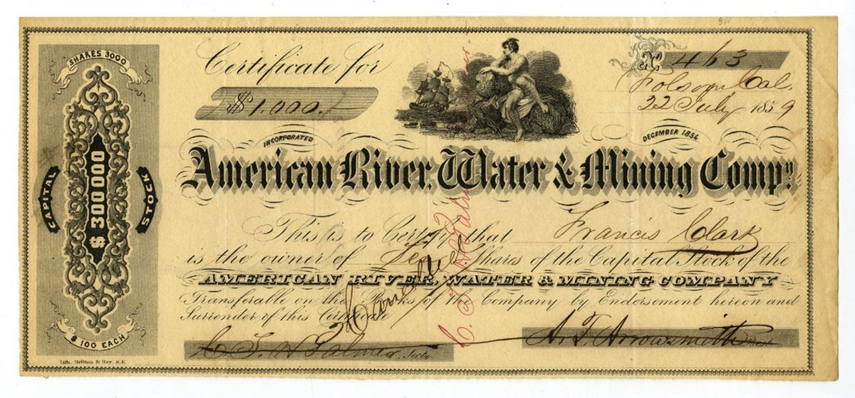 Folsom, California, 1859. 10 Shares Capital Stock I/C Certificate, Black print with small vignette at top above company title, S/N 463, Cancelled overprint, VF to XF condition.