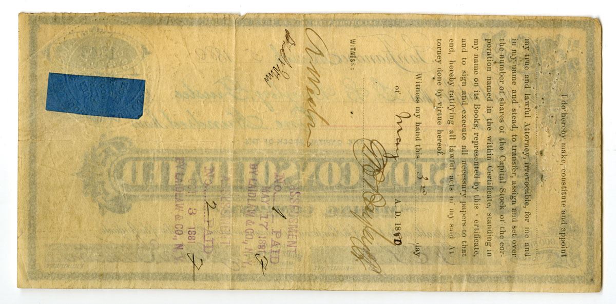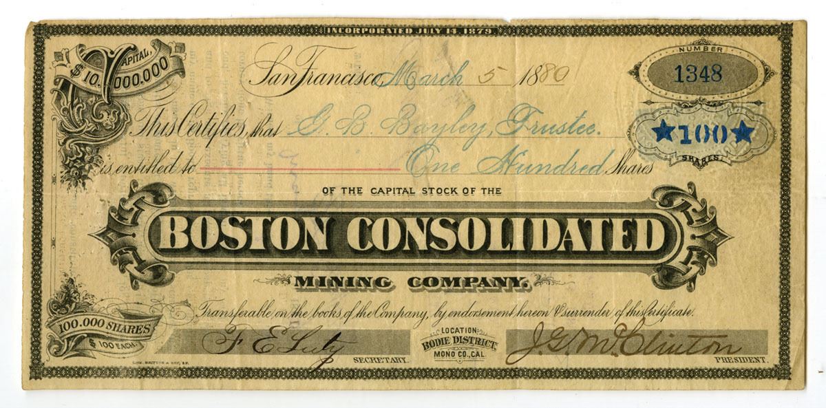 Bodie District, Mono County, CA. (Offices in San Francisco), 1880. 100 Shares Capital Stock I/U Certificate, Black print on smaller check sized certificate, Black border with company title at bottom center, S/N 1348, Mine located in Bodie District, Mondo County, California, Certificate is in VF condition.