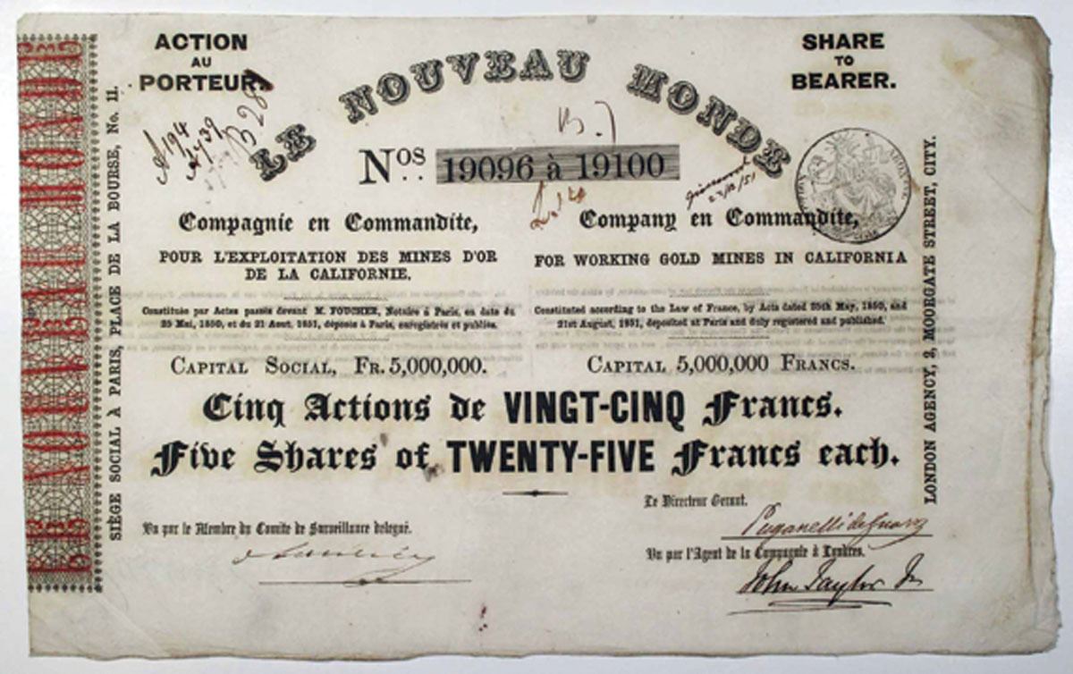 California & France. Le Nouveau Monde, 1851 5 Shrs I/U Stock Cert., Fine Black. California and France. Black print with black and red border, Bond is in French and English. For Working Gold Mines in California- "The New World." Signed by John Taylor, who created John Taylor & Sons, which developed mining businesses around the world until 1969.