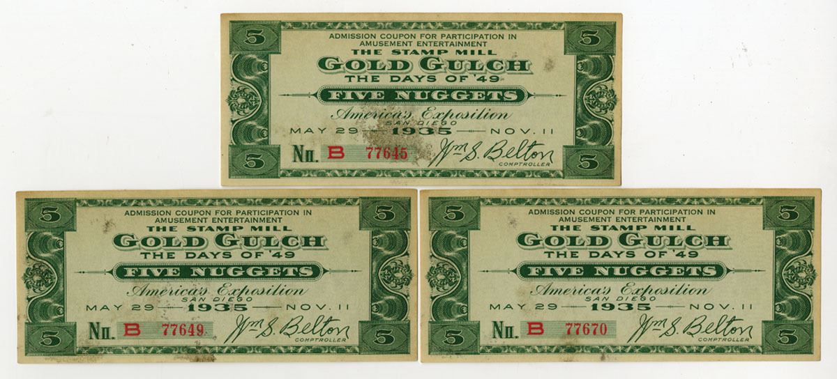 San Diego, California, 1935. Lot of 3, 5 Nuggets Admission Coupon "for participation in amusement entertainment" during America's Exposition in 1935. Coupons are Green, S/Ns B77645, B77649, and B77670, Notes range from AU to Unc condition with minor toning and stains. (3). Sold "AS IS" no returns accepted.
