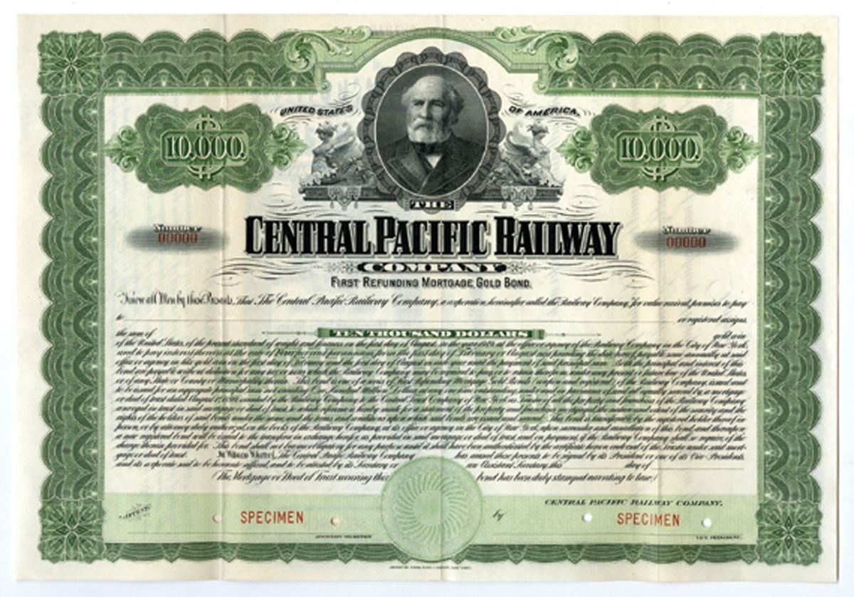 California, 1899. $1000 Registered 4% Specimen First Refunding Mortgage Gold Bond, Black on green border and underprint with portrait of Collis P. Huntington at top center, Specimen overprints and POC's, VF to XF condition. Rare and attractive bond. ABNC.