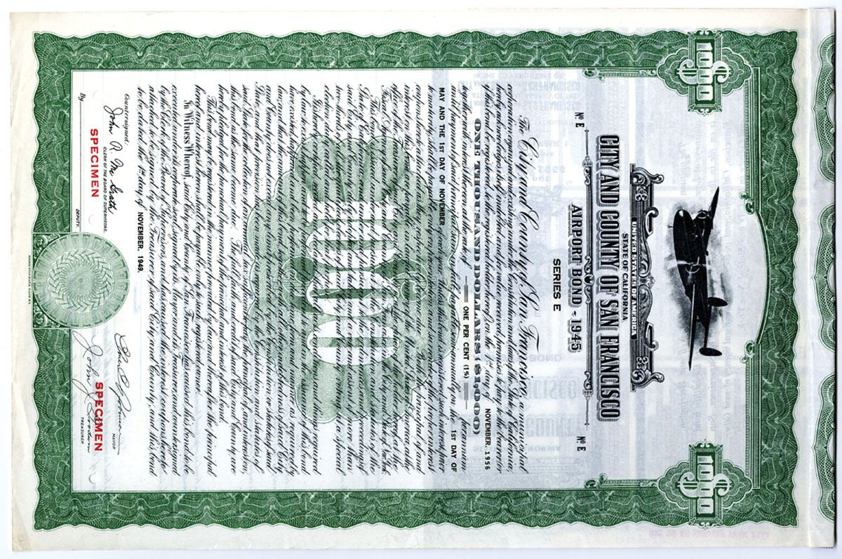 San Francisco, California, 1949. $1000 Specimen 1% Airport Coupon Bond, Black text with green border, Plane illustrated at top center. Red specimen overprints, POCs, VF condition, HBN.