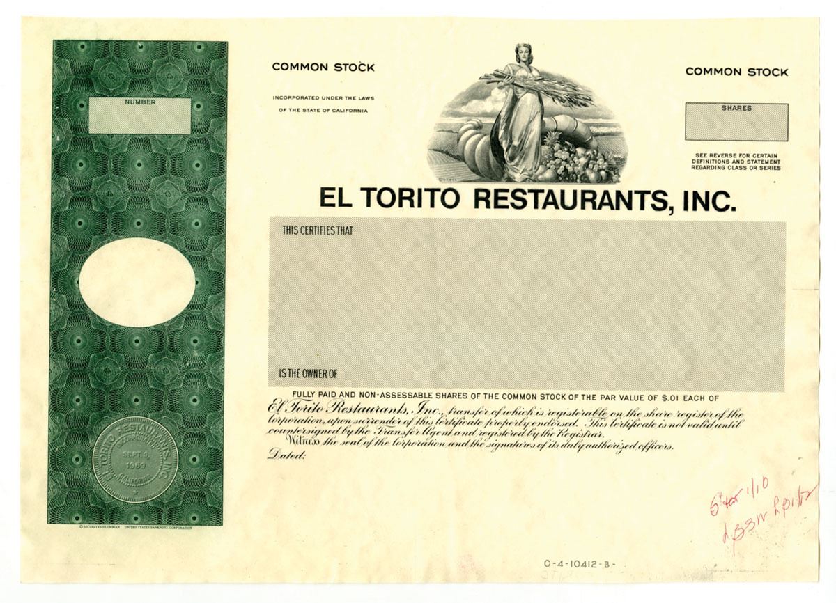 CA. El Torito Restaurants, Inc 1970s Unique Approval Proof Stock Certificate, XF. El Torito (Spanish for "the little bull") is a Mexican restaurant chain, consisting of 69 restaurants which are located primarily in California. Some of the restaurants are located in Oregon, Arizona, and overseas. El Torito is one of several Mexican cuisine restaurant chains operated by Real Mex Restaurants. Founded in 1954, El Torito claims to be "a pioneer in the California full service Mexican casual dining restaurant segment."