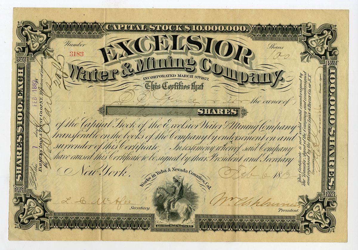Yuba & Nevada Counties, California, 1883. 100 Shares Capital Stock I/U Certificate, Black on black border with company title at top and small vignette of Native American on horseback at bottom, S/N 3183, Incorporated in California with mines located in Yuba & Nevada Counties, VF-XF condition, ABNC.