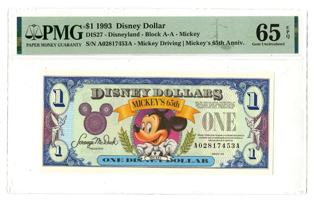 California and Florida, 1993. $1, DIS27, Issued Disney Dollar, M/c printing with Mickey Mouse at center and Tinker Bell at left and right, Back is m/c with Mickey Mouse in car, S/N A02817453A Block AA, Issued for Mickey's 65th Anniversary, PMG graded Gem Uncirculated 65 EPQ.