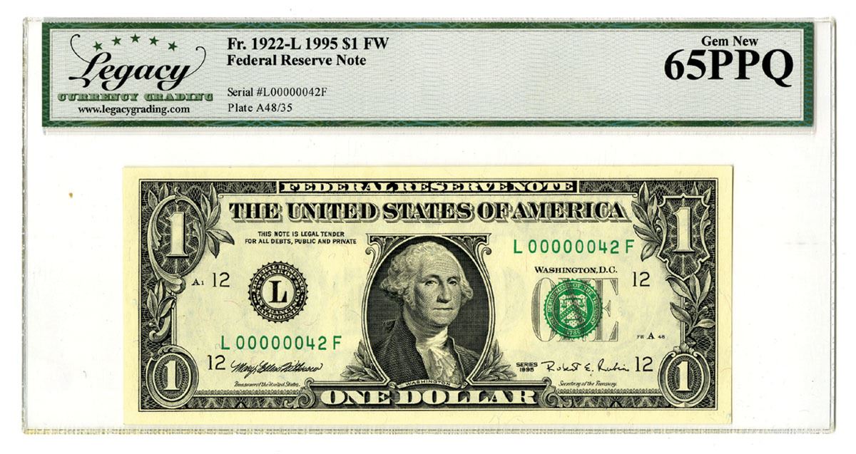 San Francisco, California, 1995. $1, P-496b, Fr.# 1922-L, Series 1995, Issued Banknote, Black print with George Washington at center, Withrow | Rubin signatures, Green seal at right, S/N L00000042F pp A48/35, Legacy graded Gem New 65PPQ.