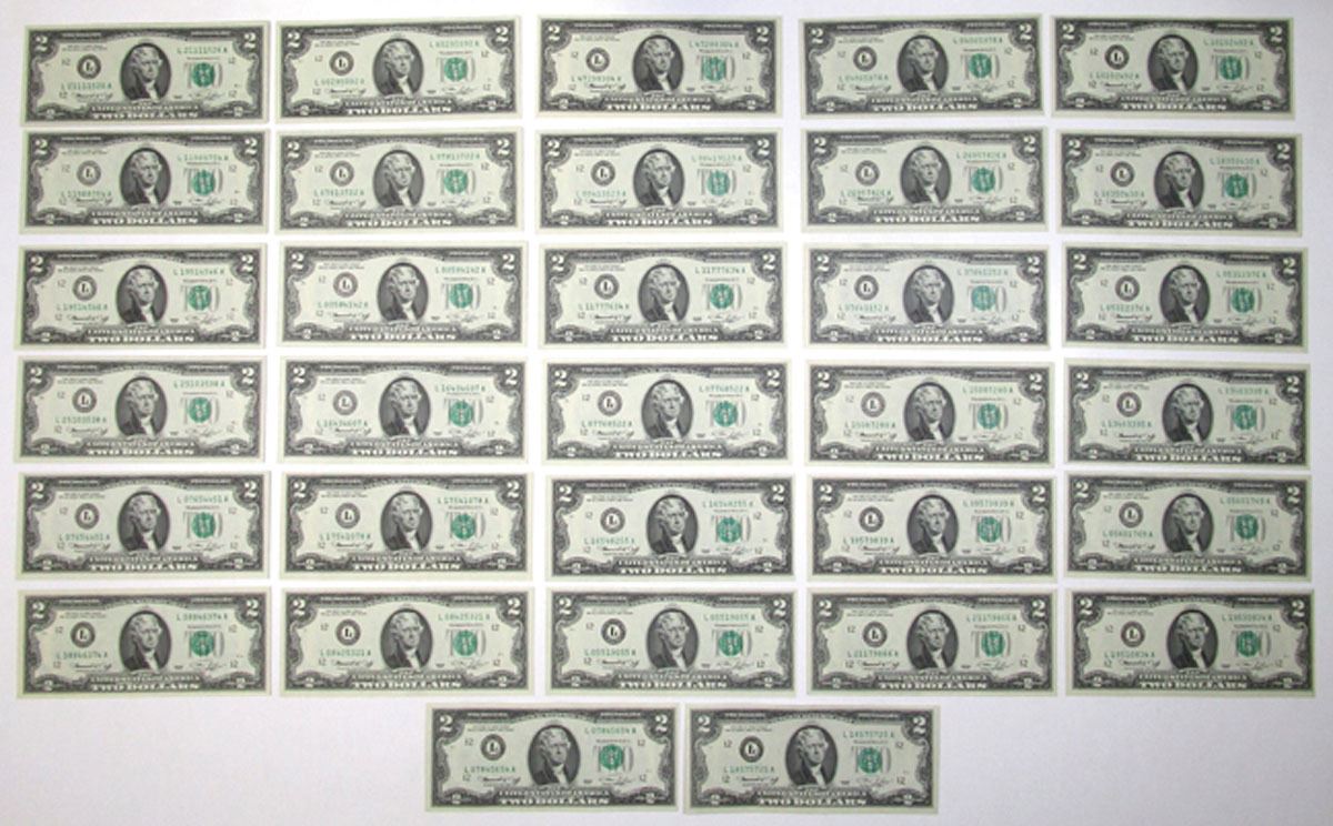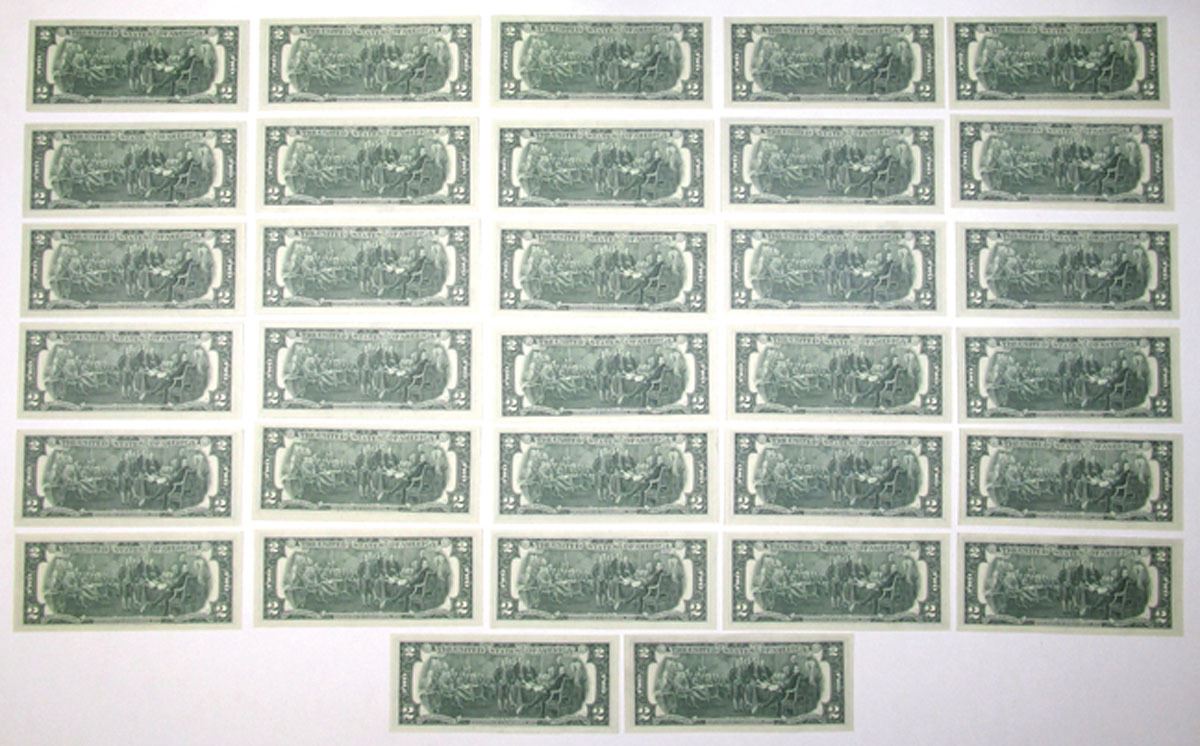 San Francisco, California, 1976. $2, P-461 (32), Fr.# 1935L, Issued Banknote Collection, Black print with Jefferson at center and green seal at right, Back shows signing of the Declaration of Independence by Trumbull, Neff | Simon signatures, Notes are in Uncirculated to Gem Uncirculated condition. (32). Complete reconstructed sheet A1 to H4.