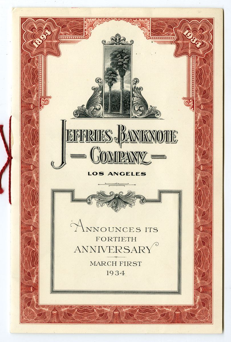 Los Angeles, California, March 1st, 1934. Jeffries Banknote Co. Program with story of the founding of the company, Intaglio printed red cover with vignette of palm trees logo over company name on face, and cycloid engraving on back, the interior has the origins story of Jeffries BNC, Uncirculated condition. The reverse side page of the front cover as a typed note "This was found among letter packets returned from Los Angeles Office after Mr. Moir's death in Sept. 1945" with a blue typed Jan 29, 1947 receiving mark below it. Rare Jeffries Banknote Company Security Printing Ephemera.