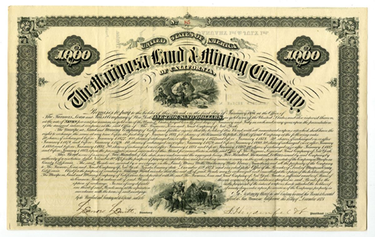 California, 1875. $1000 I/U 7% Gold Coupon Bond, Black on black border, Mining vignette under title and at bottom of certificate, VF-XF condition, Continental BNC.
