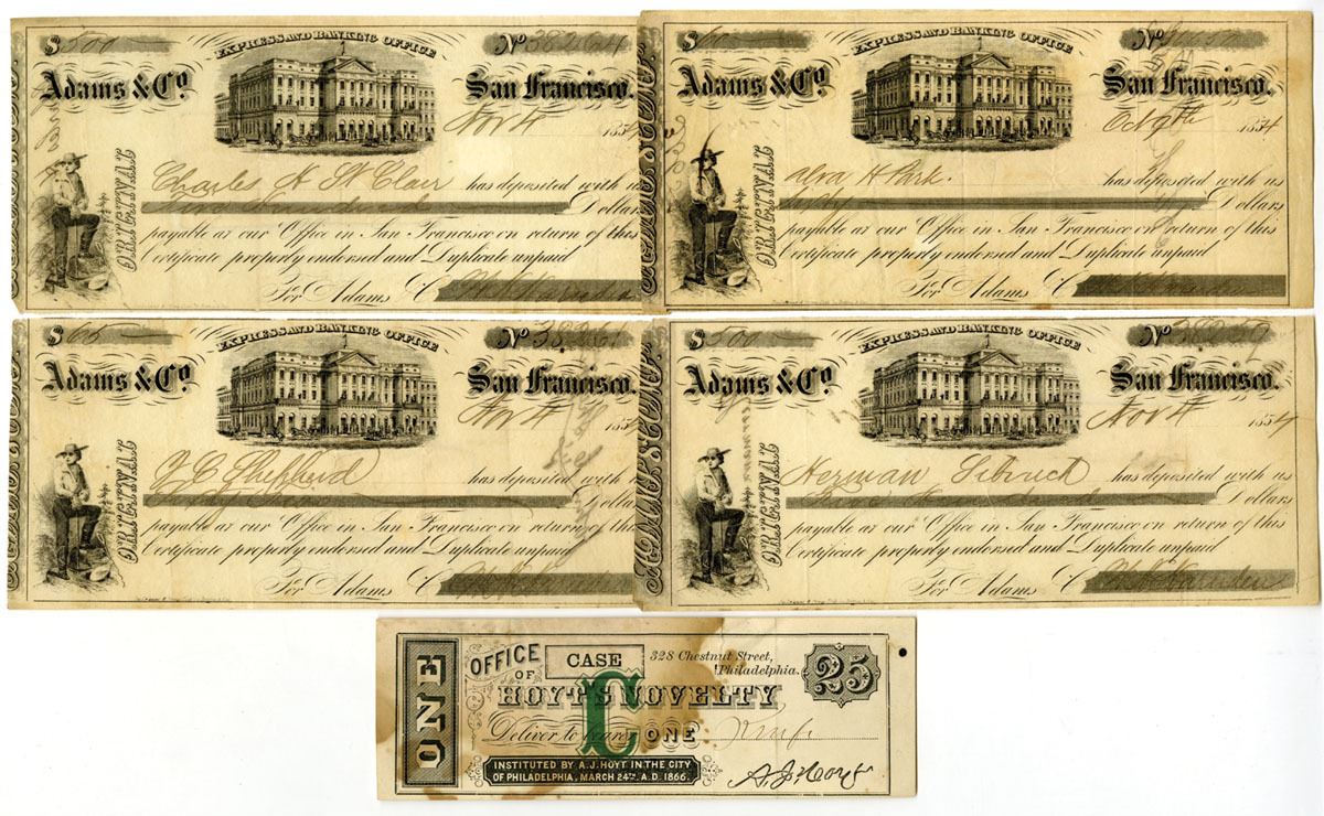 California & Pennsylvania, 1854-66. Lot of 5 I/U CDs, Includes: 1854. Adams & Co., Express and Banking Office Group of 4 CDs in various amounts, Black print with large building at center; 1866, Office of Hoyt's Novelty Credit, Black print with green underprint. CDs range from Fine to VF+ condition. (5). Sold "AS IS" no returns accepted.