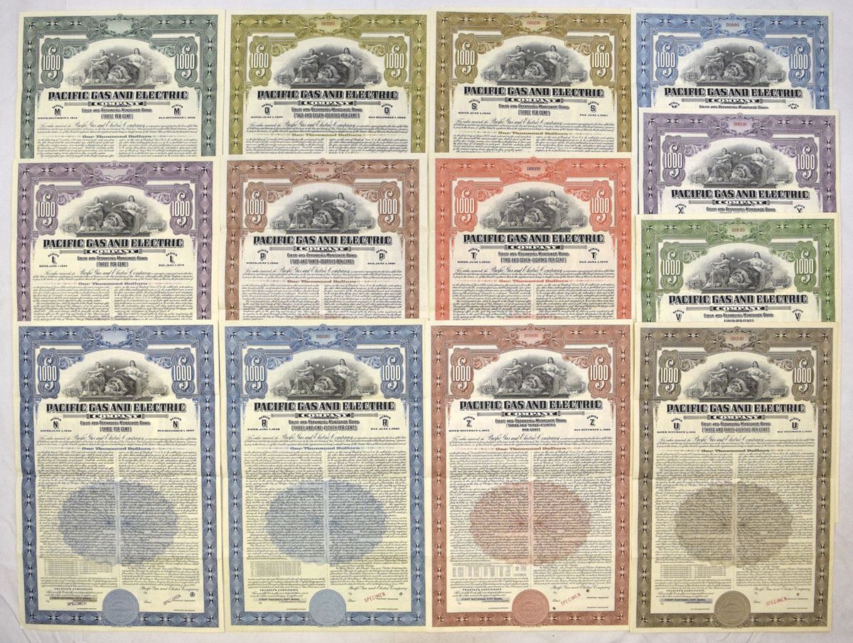 California, 1944-55. Lot of 13 Specimen Coupon Bonds, All with similar vignettes but different color borders and underprints, includes: $1000 Series L, 1944; $1000 Series M, 1944; $1000 Series N, 1945; $1000 Series P, 1946; $1000 Series Q, 1947; $1000 Series R, 1948; $1000 Series S, 1949; $1000 Series T, 1950; $1000 Series U, 1951; $1000 Series V, 1952; $1000 Series X, 1953; $1000 Series Y, 1954; $1000 Series Z, 1955. All have Specimen overprints and POCs, are in XF to AU condition, printed by ABNC. (13). Sold "AS IS" no returns accepted.