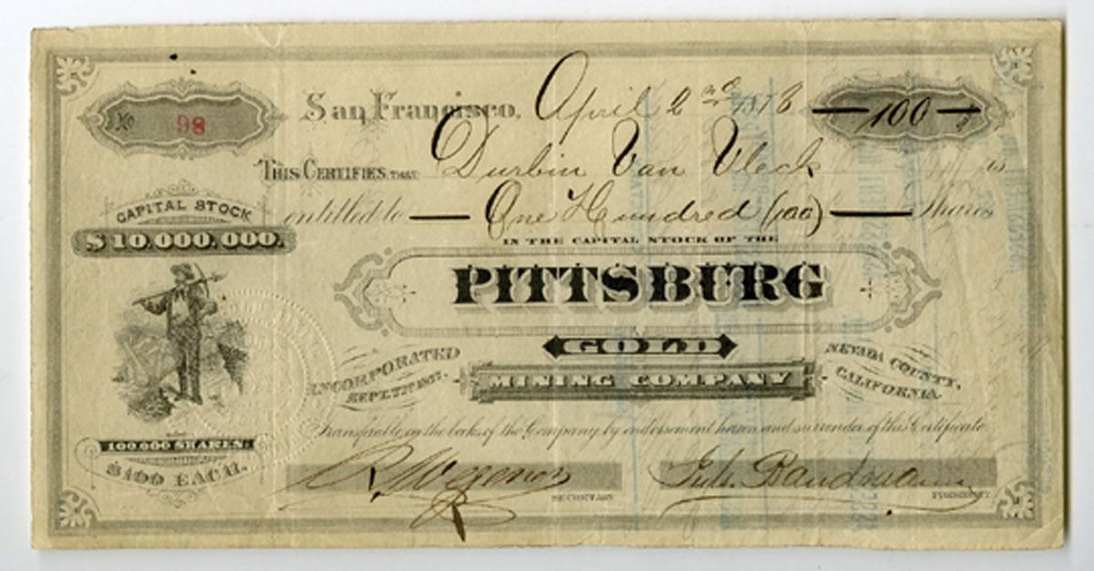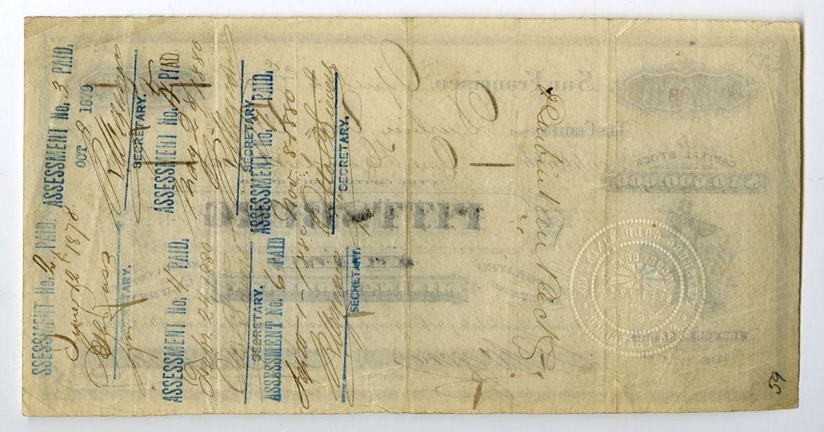 San Francisco, California, April 2nd, 1878. 100 Shares Capital Stock I/U Certificate, Black printing with small vignette of miner at left and company title at center, S/N 98, Fine to VF+ condition.