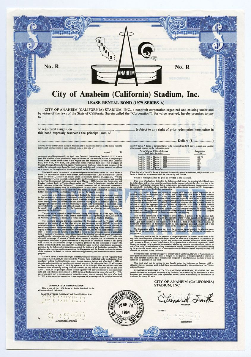 California, 1990, $-Odd, 1979 Series A Lease Rental Specimen Bond, Vertical format, Black on blue border and underprint, Rams football and Angels baseball logo along with depiction of the stadium, Pin-punch cancelled, XF condition, SCBNC. Stadium right next door to Disneyland.