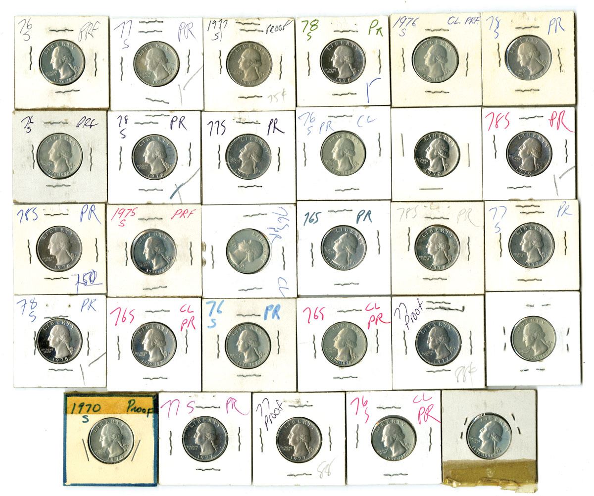 San Francisco, California, 1970-78. Lot of 29 Proof Quarters, Includes: 1970-S (2); 1976-S (7); 1977-S (7); 7 from 1978; all are clad quarters. Coins are all in flips and range from Choice to Gem Proof condition. (29). Sold "AS IS" no returns accepted.
