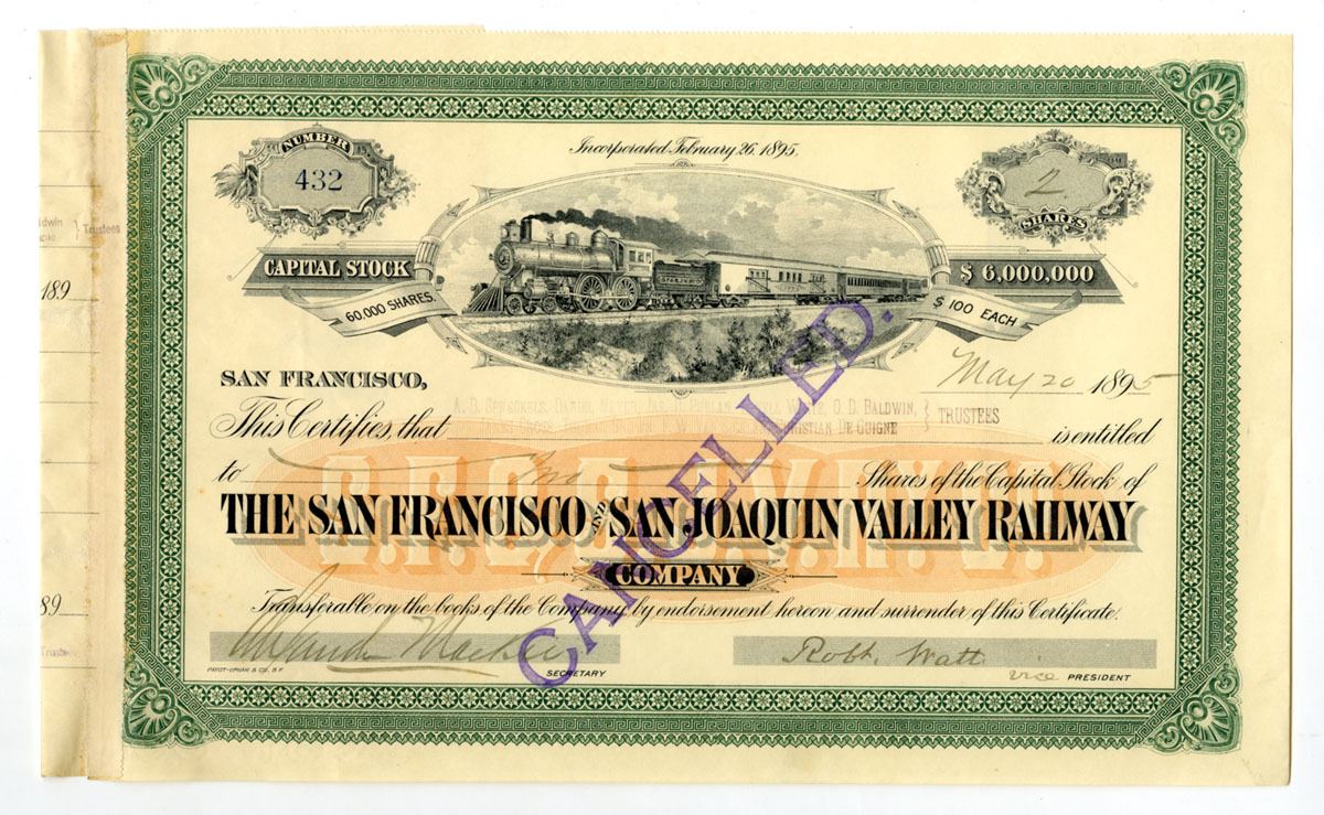 San Francisco, California, 1895. 2 Shares Capital Stock I/C Certificate, Black print with green border and orange underprint, Locomotive vignette at top center with company title at bottom center, S/N 432, Cancelled stamp overprint at center, VF to XF condition.