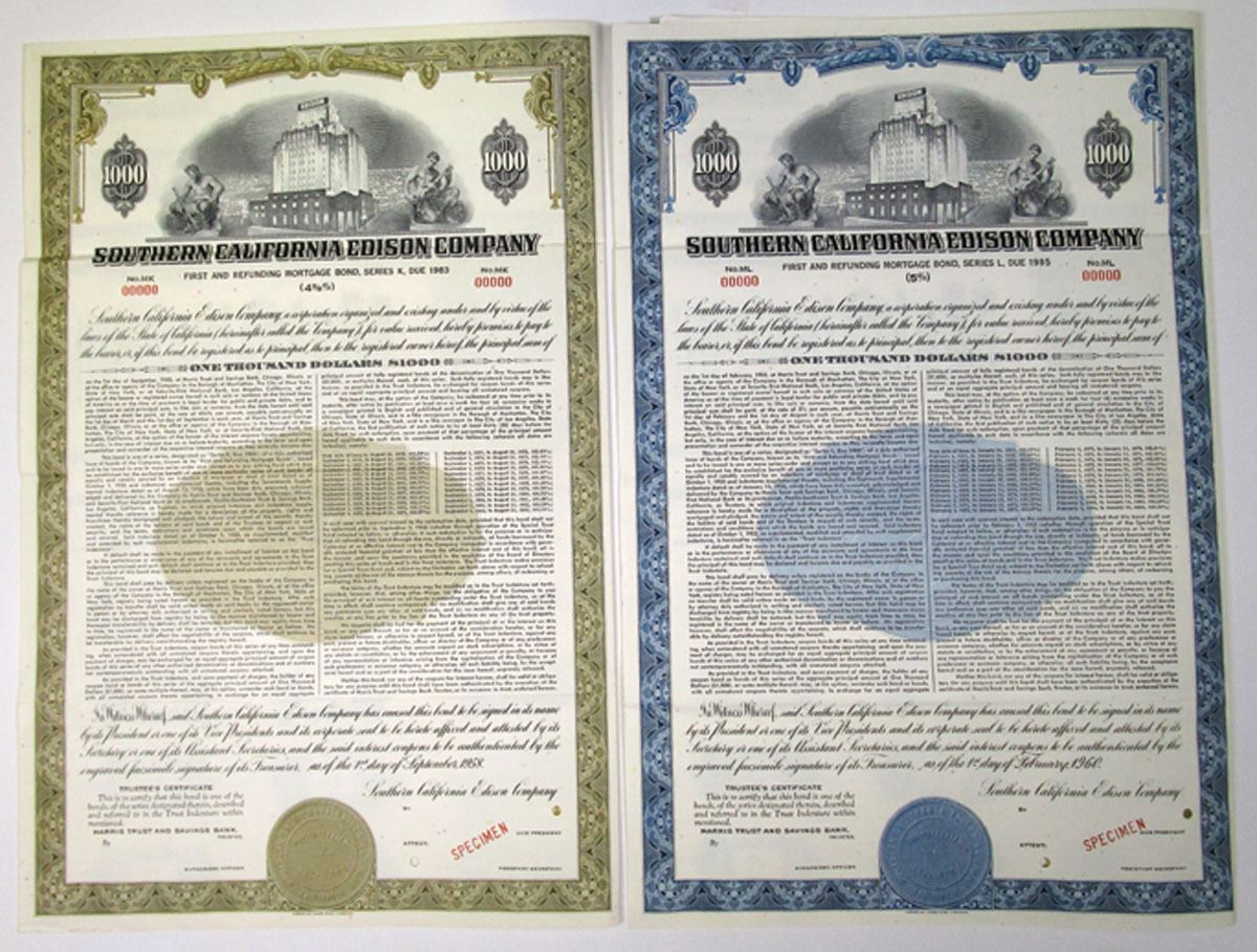 California, 1958-60. Lot includes 2 Specimen Bonds, both are $1000 First and Refunding Mortgage Coupon Bonds: 4 5/8% in olive, Series K; and 5% in blue, Series L. Both have red specimen overprints, 00000 serial numbers, and POCs. VF-XF condition, ABNC. (2)