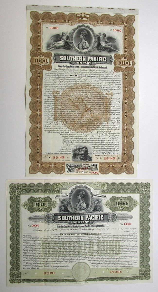 California, 1899. Lot of 2 Specimen Bonds, Includes $1000, 4% Coupon Bond with Brown border and underprint; and, $1000 4% Registered Bond with Olive green border and underprint. Both have same vignette of woman in circular frame at top, Specimen overprints, POCs, VF to XF condition, printed by ABNC. (2). Sold "AS IS" no returns accepted.