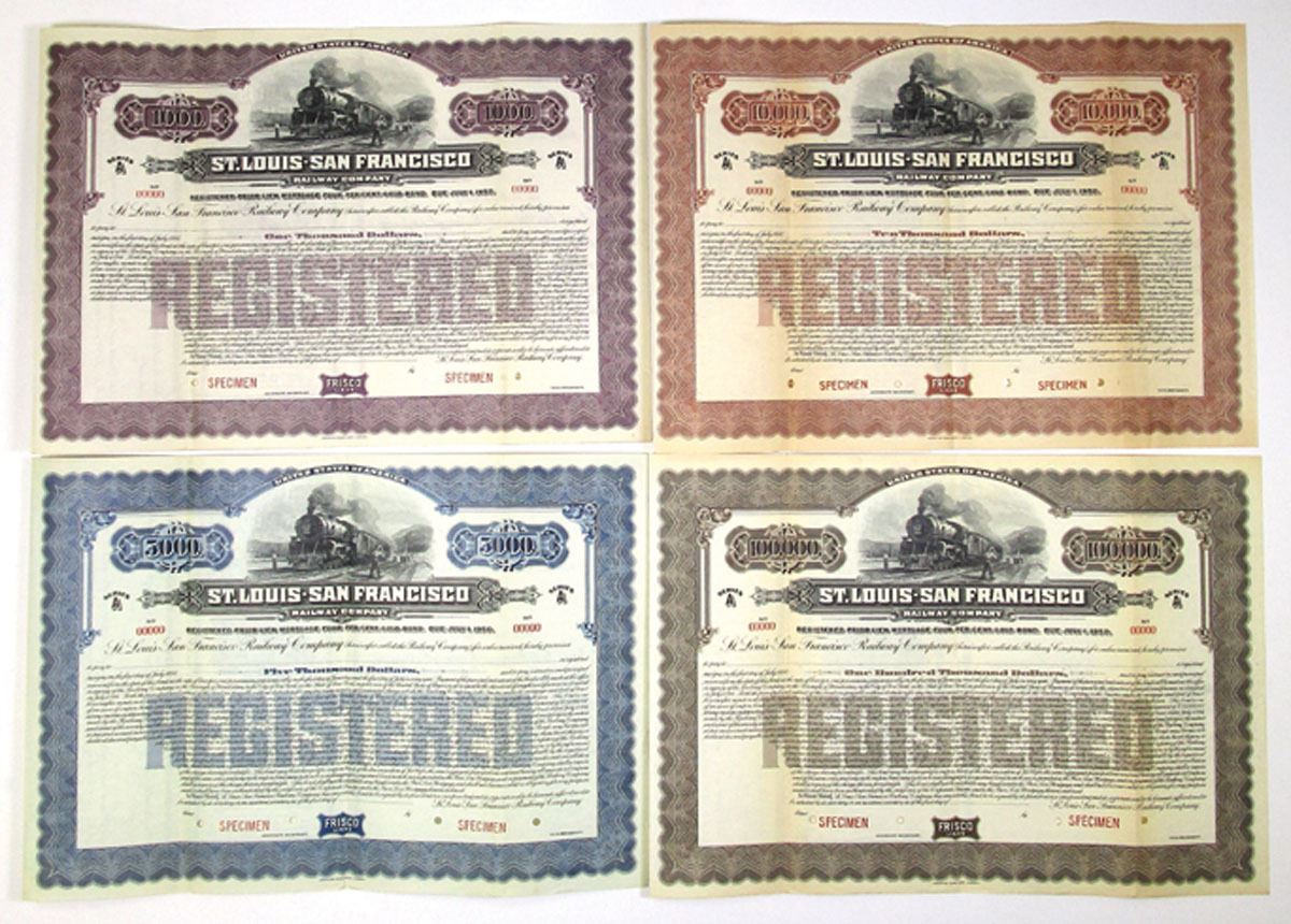 California, 1900, Lot of 4 Specimen Bonds, Includes: $1000 4% Registered Prior Lien Mortgage Gold Bond, Black with purple border; $5000 4% Registered Prior Lien Mortgage Gold Bond, Black with blue border; $100,000 4% Registered Prior Lien Mortgage Gold Bond, Black with dark brown border, All have a train passing signal men at top center, Specimen overprints, POCs, are in VF to XF condition, printed by ABNC. (4). Sold "AS IS" no returns accepted. All are known as specimens only, no issued examples known. All rare.