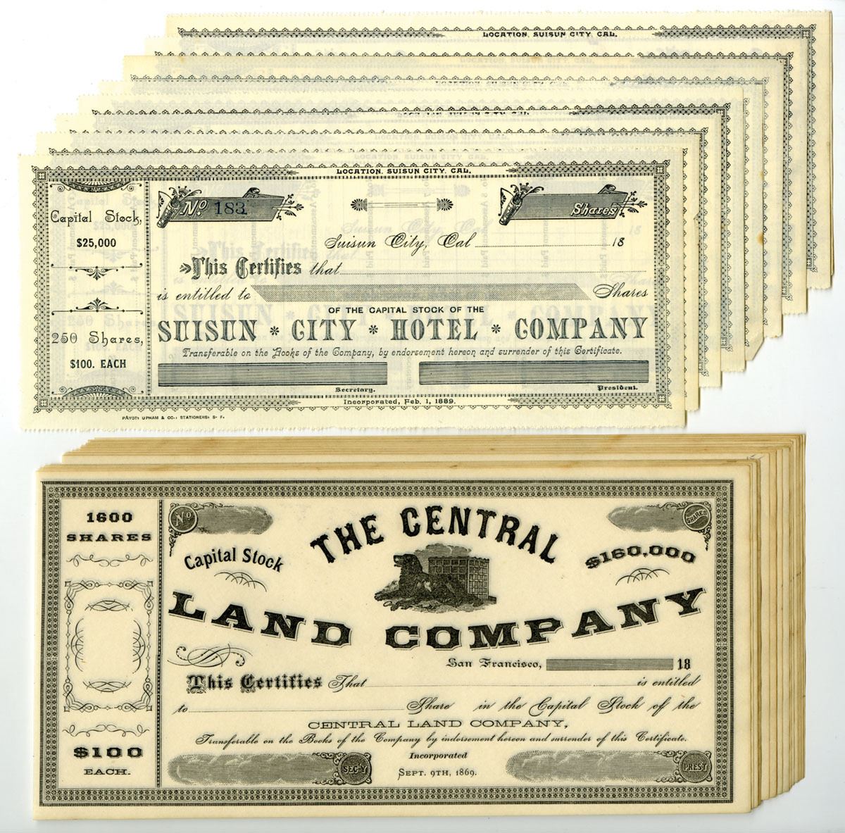 California, ND (ca.1860s-80s). Lot of 30 U/U Stock Certificates for Suisun City Hotel Co. (9) and for Central Land Co. (21), All have black print on white paper with simple black geometric borders, XF to Uncirculated condition. (30). Sold "AS IS" no returns accepted.
