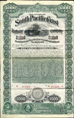 1887. $1,000. Specimen 1st Mortgage 4% Guaranteed Gold Bond. Green border. Steamship at dock with train and ornate border with George Washington on bottom with sphinxes. Red specimen overprints, POC's and "00000" serial numbers. Coupons attached. Rare certificate. Unlisted in Cox. Extremely rare bond. HLBNC.