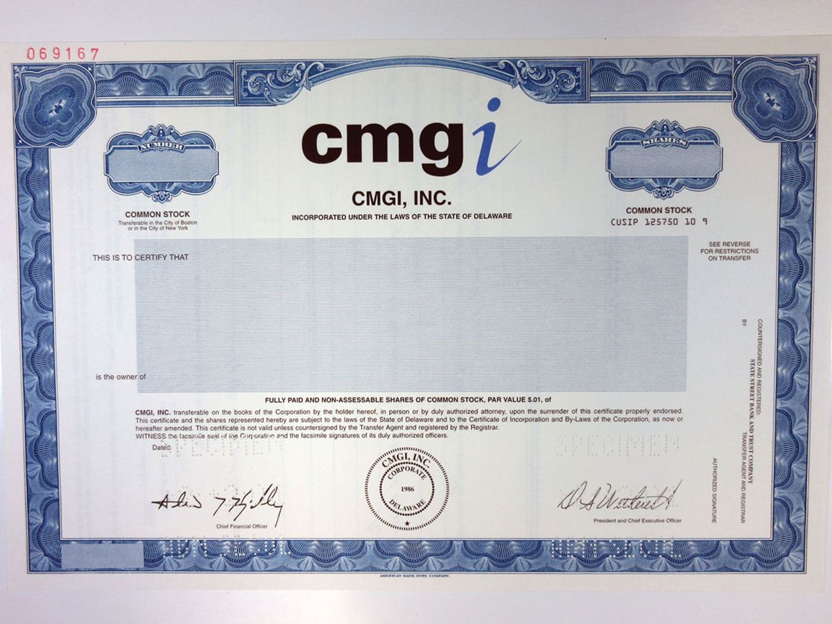 Delaware, 2001. Common Stock Specimen Certificate, Black with blue border and underprint with company title at top, Pin punched Specimen, XF to AU condition, ABNC. CMGI, Inc. (now known as ModusLink Global Solution) during the dot-com bubble the company had a market capitalization of $41 billion and owned the naming rights to the home stadium of the New England Patriots. Between 1995 and 1999, its stock was the best performing stock in the United States.