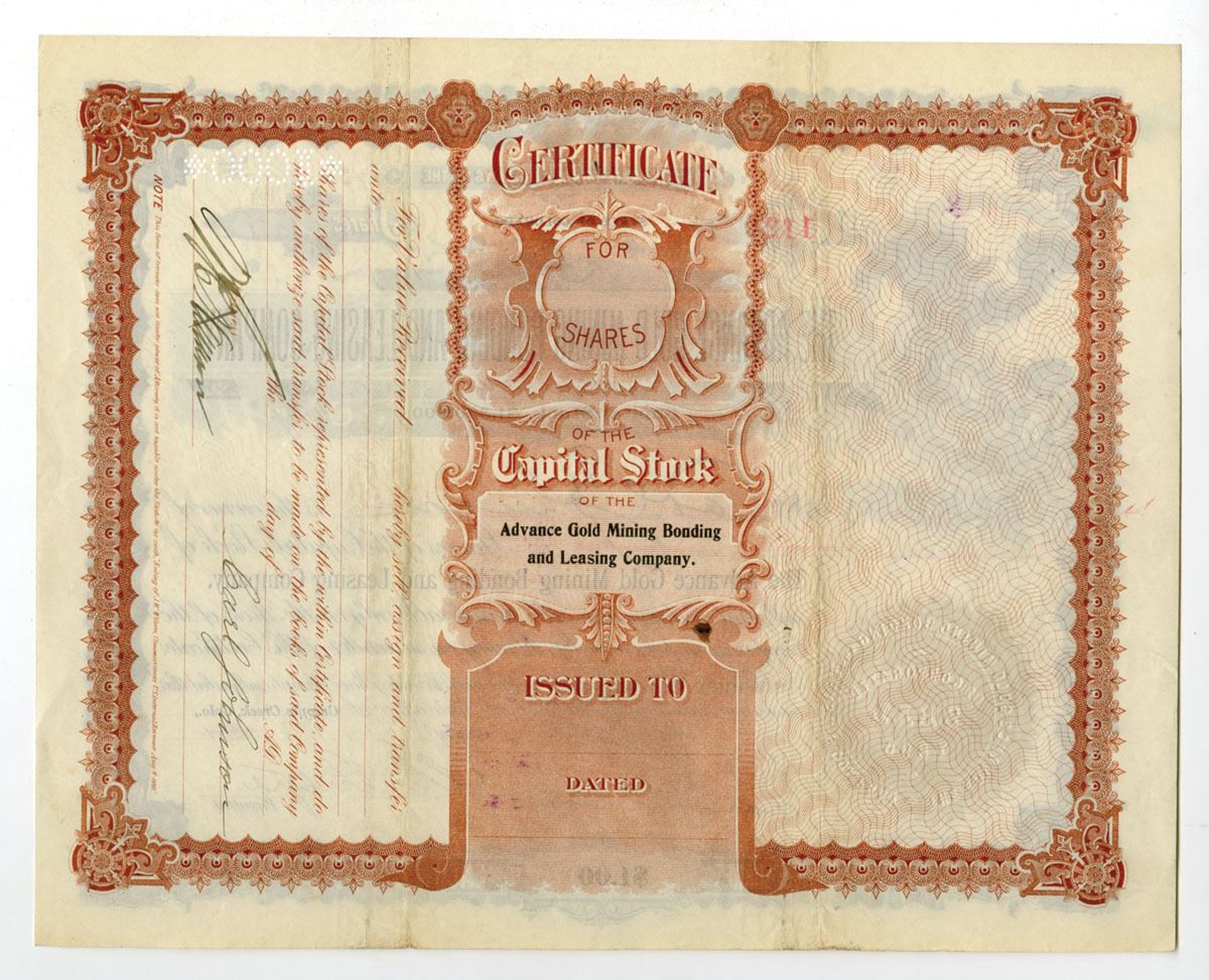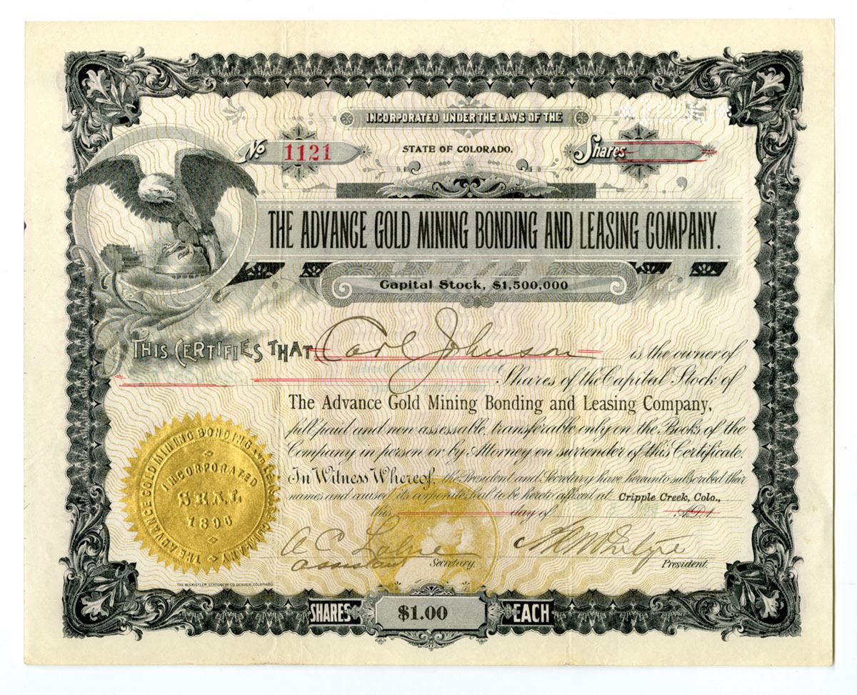 Cripple Creek, Colorado. ND (1880-90s). 1000 Shares Capital Stock Certificate, Black print with black border and eagle vignette left of title , S/N 1121, VF to XF condition.