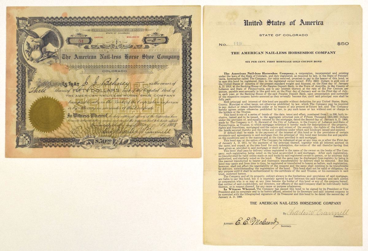Colorado, 1908. Lot of 2 items, Includes: American Nail-Less Horse Shoe Co., 3 Shares Capital Stock I/U Certificate, Black print with black border and bronze underprint, Company title at top with bald eagle vignette at top left and bronze seal at bottom left, S/N 51; $50 I/U 6% First Mortgage Gold Coupon Bond, Black print with no embellishments or border, S/N 119. Certificates range from Fine to VF+ condition with staining on stock. (2). Sold "AS IS" no returns accepted.