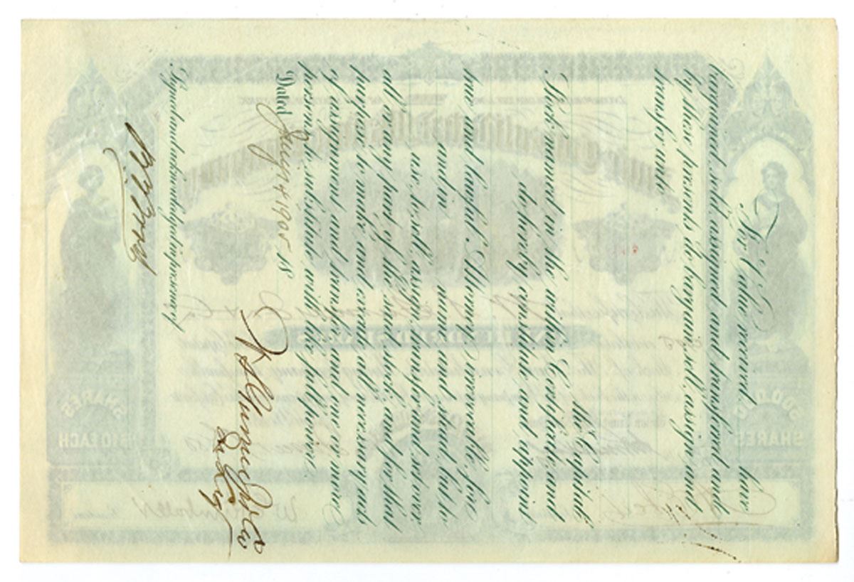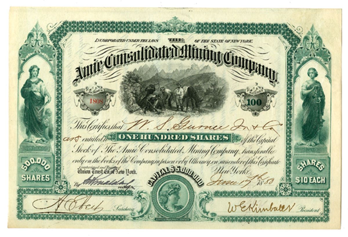 Leadville..., CO. (Inc. and Offices in New York), June 17, 1880, Amie Consolidated Mining Company, 100 Shares I/U stock certificate, S/N 1808, black text and ornate green border and underprint with detailed standing allegorical women at left and right, central vignette of miners at work in a mountainous landscape, ornate young woman in medallion at lower center, printed by American Bank Note Co., AU to Uncirculated condition or better. Like many “consolidated” ventures of the period, Amie brought together multiple claims or properties under one corporate umbrella to attract capital and compete with the larger producers.