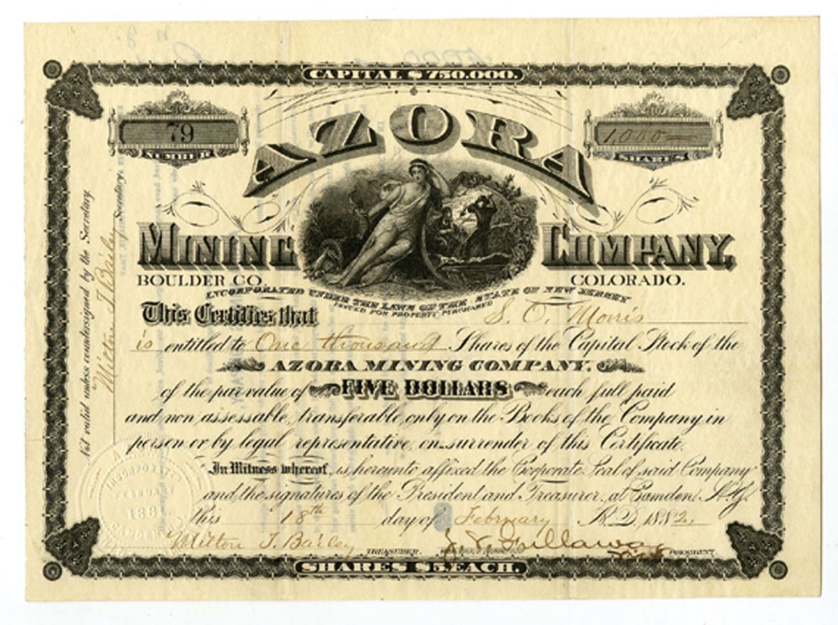 Boulder, Colorado (Incorporated in New Jersey), 1882. 1000 Shares, I/U Capital Stock Certificate, Black printing with woman leaning on shield with mining scene at center at top amongst title, S/N 79, XD to AU condition. Nation Bureau of Engraving & Printing.