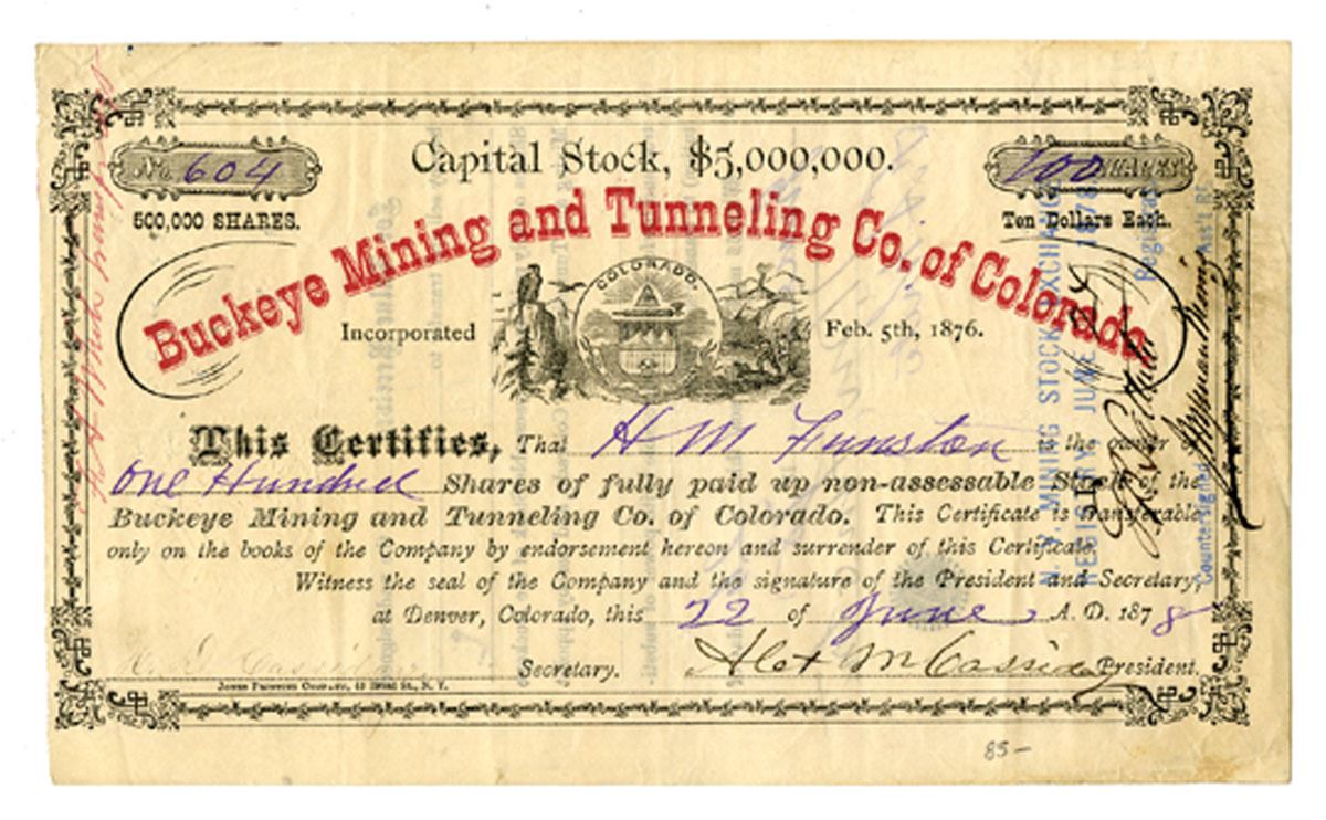 Denver, Colorado, 1878. 100 Shares I/U Stock Certificate, Black and red printing with black border, Arms of Colorado at center under title, S/N 604, Signed by Alex M. Cassidy as President and H. D. Cassidy as Secretary, VF to XF condition. Jones Printing Co.