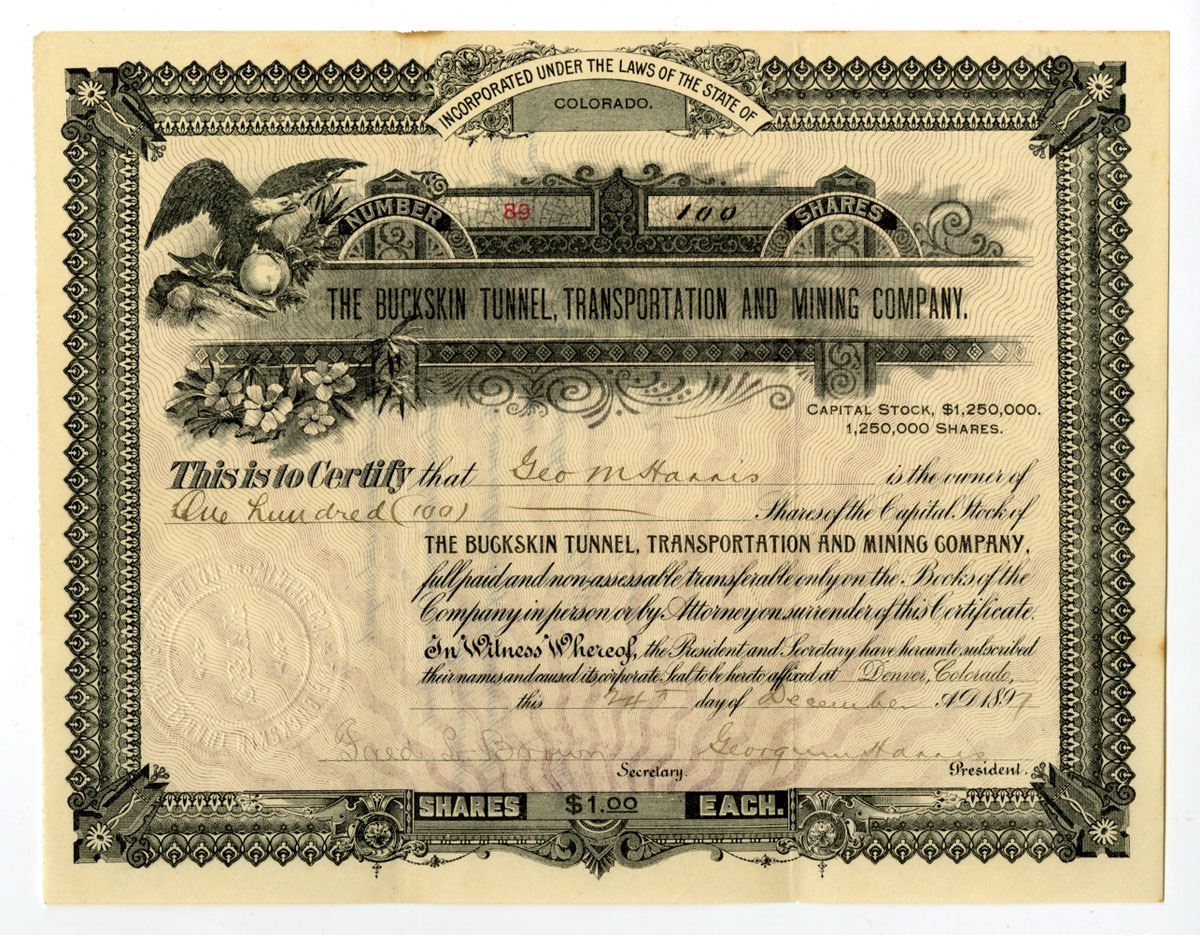 Denver, Colorado, 1897. 100 Shares Capital Stock I/U Certificate, Black print with black border and purple underprint, Bald Eagle to left of title at top center S/N 89, XF to AU condition,