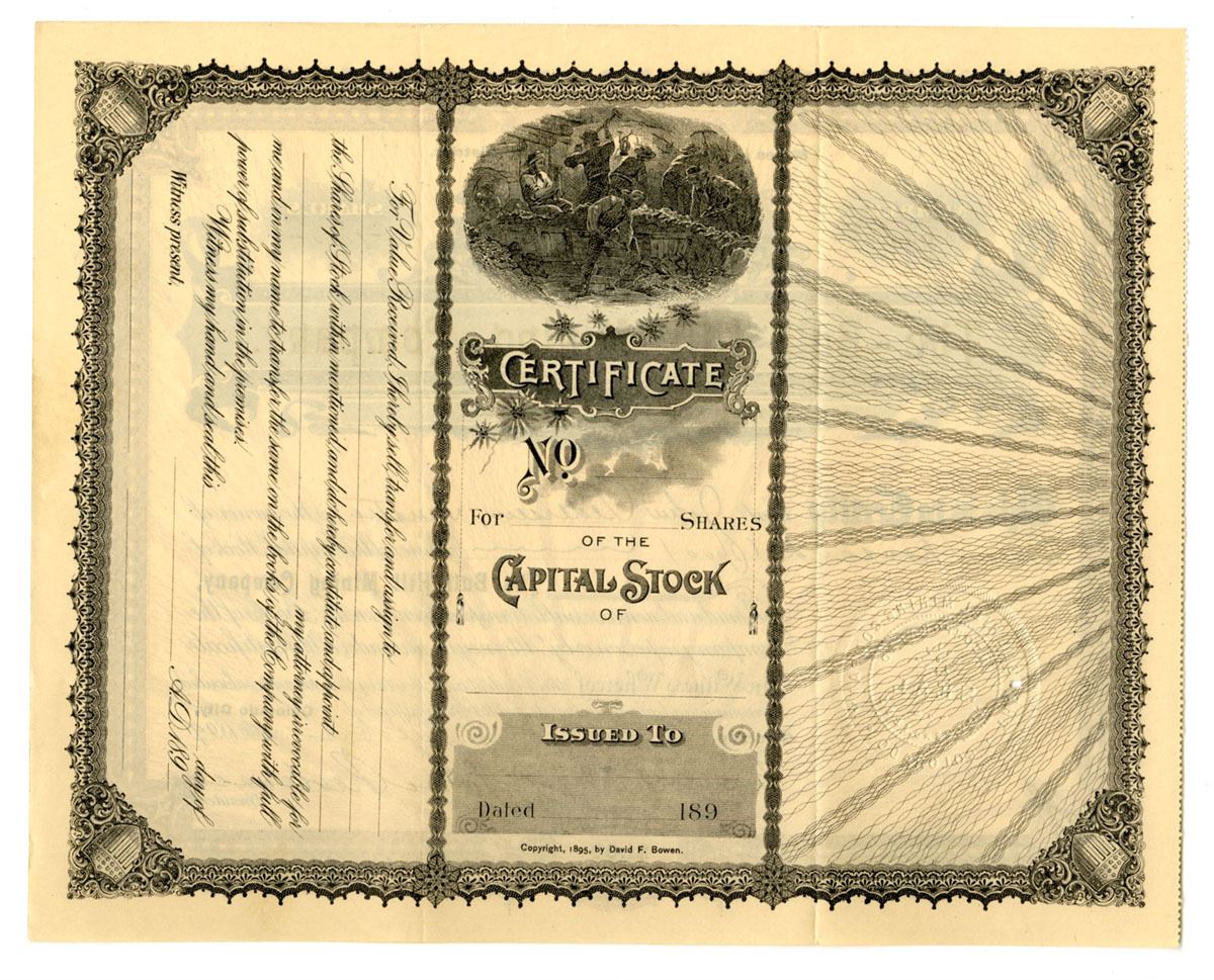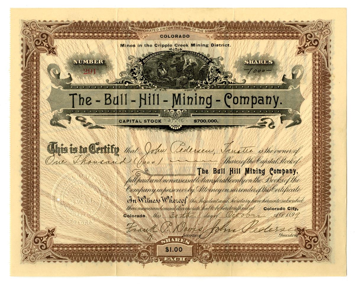 Colorado City, Colorado, 1899. 1000 Shares Capital Stock I/U Certificate, Black print with brown border and mining vignette over title, S/N 291, VF to XF condition. Mines located in Cripple Creek.