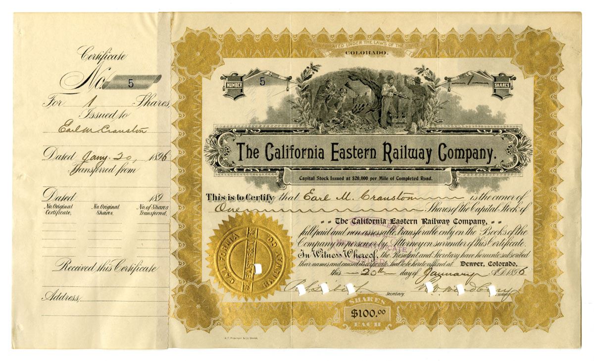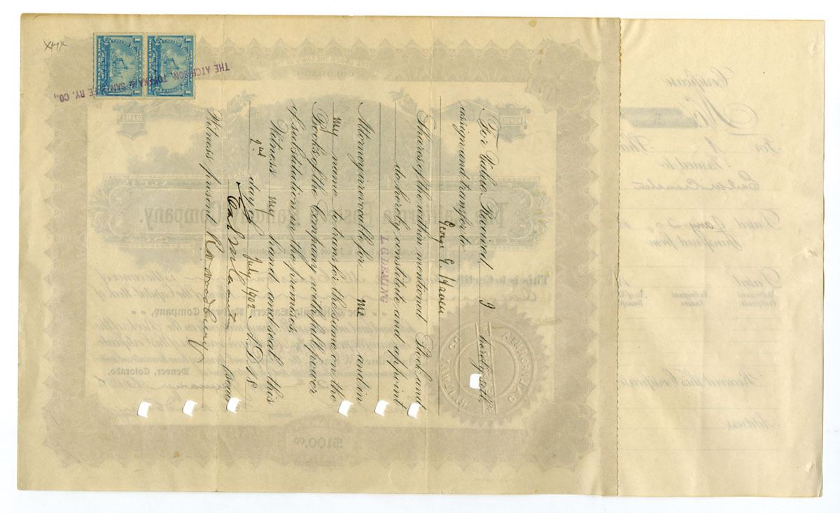 Denver, Colorado, 1902. 1 Share I/C Capital Stock Certificate, Low Serial #5, Black text with ornate golden border, no underprint, Scene at top of miners at work. VF to XF condition.