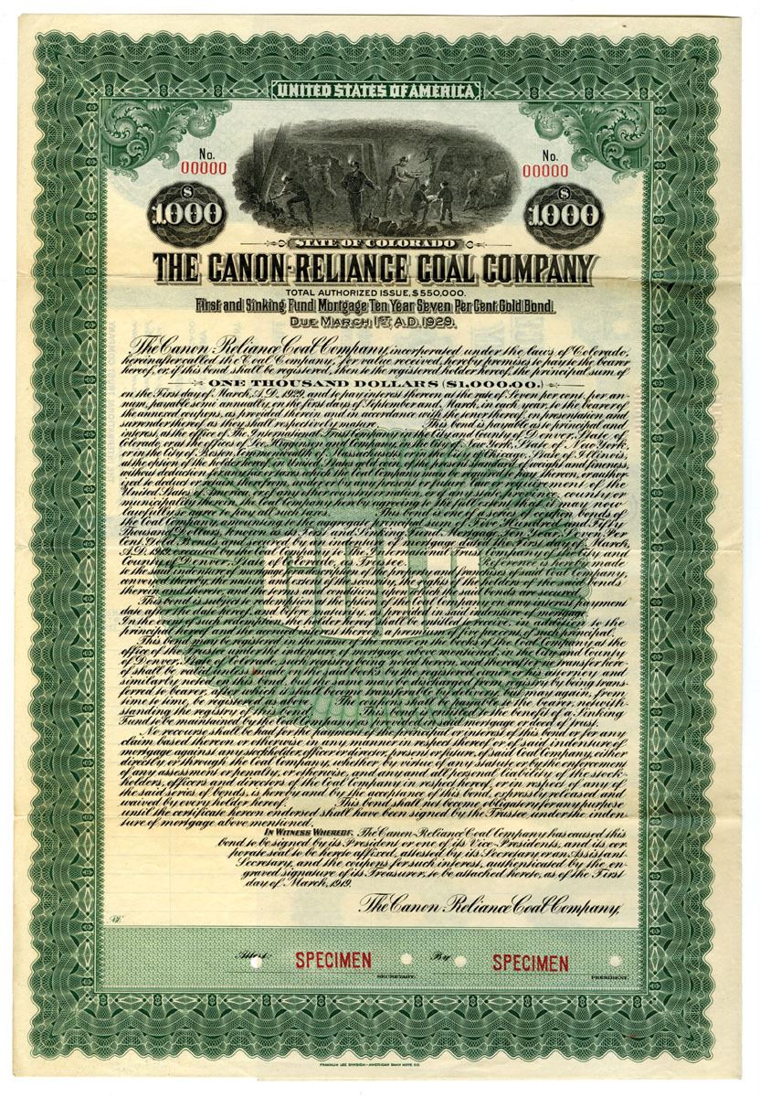 Colorado, 1919. $1000 Specimen 7% First and Sinking Fund Mortgage Gold Coupon Bond, Black print with green border and underprint, Mining vignette at top center, VF to XF condition, FL-ABNC.