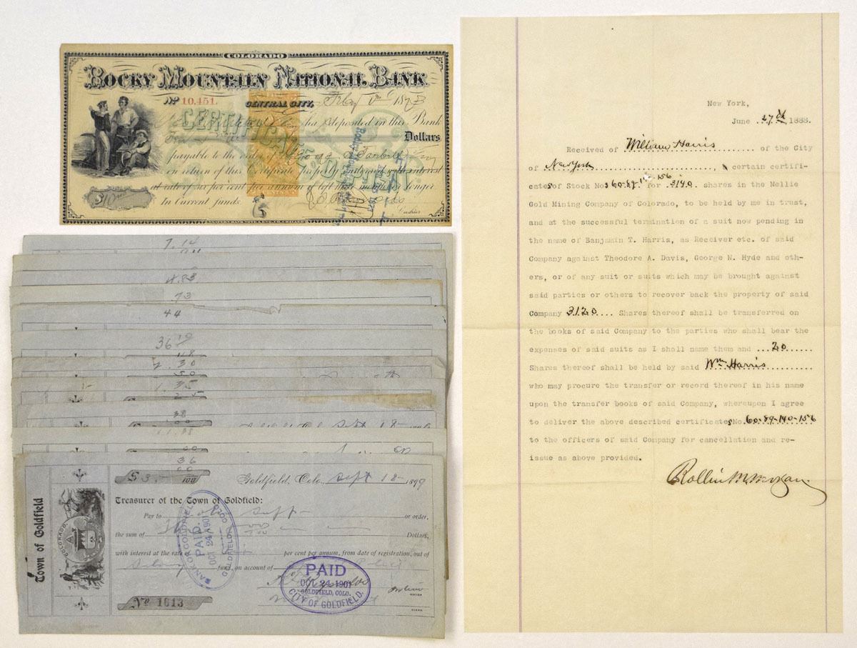 Colorado, 1873-1909. Lot of 13 Issued Banking, Mining and Municipal Documents, Includes: 1873, Rocky Mountain National Bank I/C Cert. of Deposit with Imprinted 5 cents orange revenue, Printed by Western BNC; June 27th, 1888, Nellie Gold Mining Co. legal trust document relating to 314 shares held in trust pending litigation; and, 11 Town of Goldfield treasury warrants dated 1899 to 1909. Conditions range from Fine to VF with folds, toning and edge wear typical of issued documents. (13). Sold "AS IS" no returns accepted.