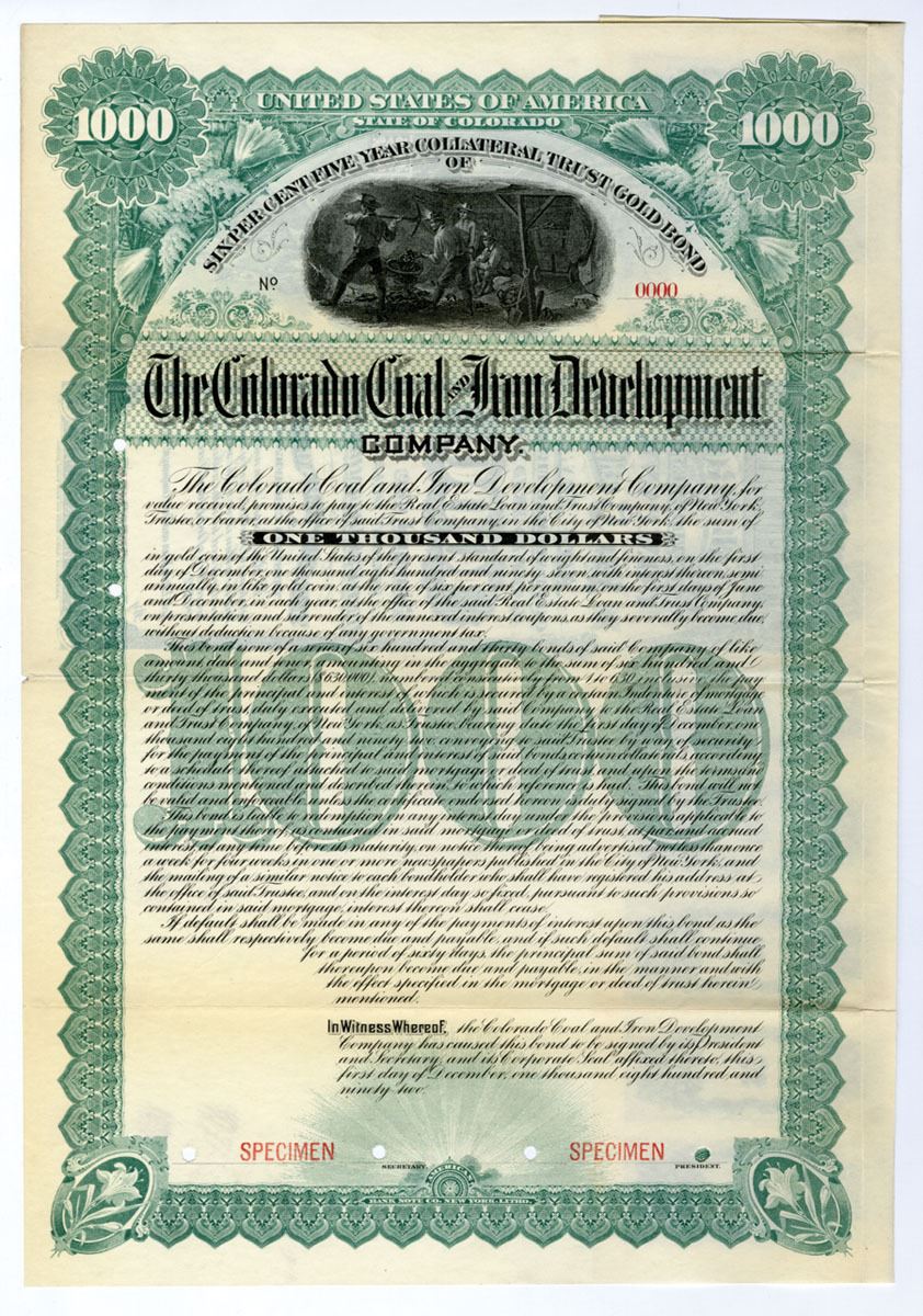 Colorado, 1892. $1000 Specimen 6% Five Year Collateral Trust Gold Coupon Bond, Black print with ornate green border and underprint, Company title at top center below mining vignette, Specimen overprints and POCS, VF to XF condition. ABNC.