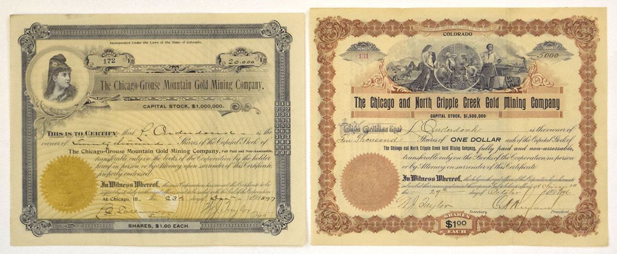 Colorado, 1896-97. Lot of 2 I/U Stock Certificates, Includes: 1896, Chicago and North Cripple Creek Gold Mining Co., 5000 Shares Capital Stock, S/N 131; and, 1897, Chicago-Grouse Mountain Gold Mining Co., 20,000 Shares Capital Stock, S/N 172. Both certificates are in VF to XF condition. (2). Sold "AS IS" no returns accepted.