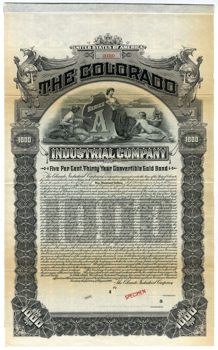 Colorado. $1,000 Specimen 5% Thirty Year Convertible Gold Coupon Bond, Black on gray border and underprint, Impressive large vignette of seated Allegorical women and child flanking "Series A" top center, Specimen overprint and POC's, VF condition with reinforced horizontal folds, International BNC.