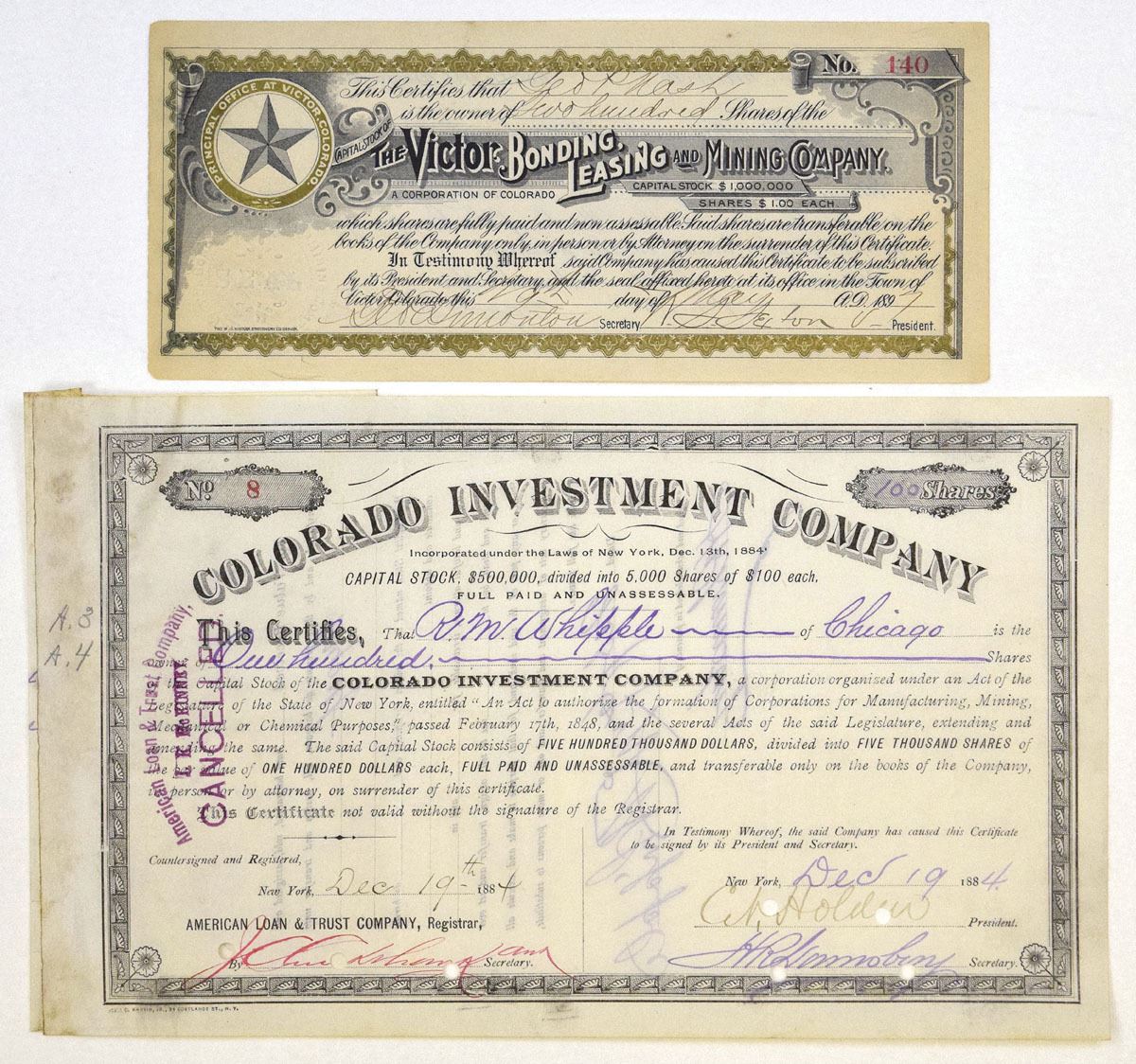 Colorado, 1884 & 1897. Lot of 2 Issued Stock Certificates, Includes: 1884, Colorado Investment Co., 100 Shares I/C Capital Stock Cert., S/N 8; and, 1897, Victor Bonding, Leasing and Mining Co., 200 Shares Capital Stock I/U Certificate, S/N 140. Condition ranges from VF to XF. (2). Sold "AS IS" no returns accepted.