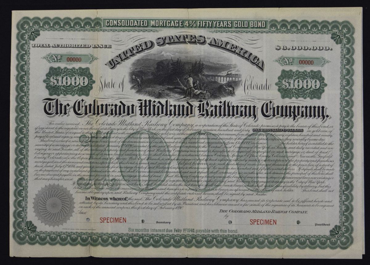 Colorado, 1890. $1000 Specimen 4% Consolidated Mortgage Fifty Year Gold Coupon Bond, Black print with green border and underprint, Surveyor at tip center with sweeping mountain views, Specimen overprints and POCs, VF to XF condition with toning at fold lines. ABNC.