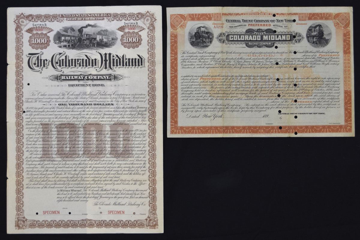 Colorado, 1890. Lot of 2 Certificates, Includes: 1890, $1000 Specimen 6% Equipment Coupon Bond with brown border and underprint and specimen overprints; and, ca.1890s, 60,000 Shares U/U Preferred Stock Certificate, Black with orange border and underprint. Both have POCs and are printed by ABNC. (2).