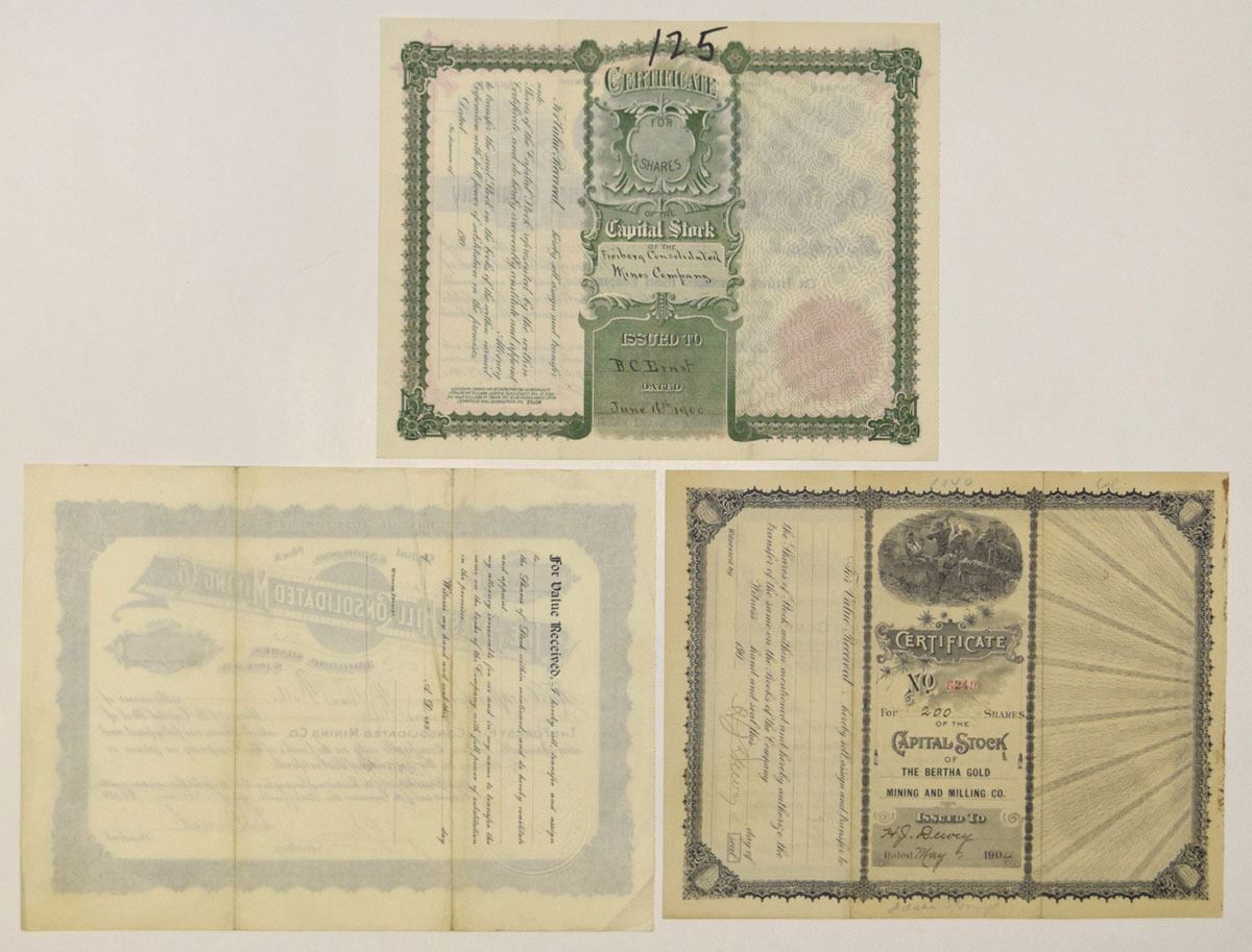 Colorado...., 1897-1904. Lot of 3 I/U Mining Stock Certificates representing late 19th to early 20th century Colorado mining operations, each with ornate borders, engraved mining vignettes, and embossed corporate seals. Includes1900, Freiberg Consolidated Mines Co., with S/N #1; 1897, Forest Hill Consolidated Mining Co.; and, 1904, Bertha Gold Mining and Milling Co. Conditions range from VF to XF overall, with minor handling. (3). Sold “AS IS” no returns accepted.