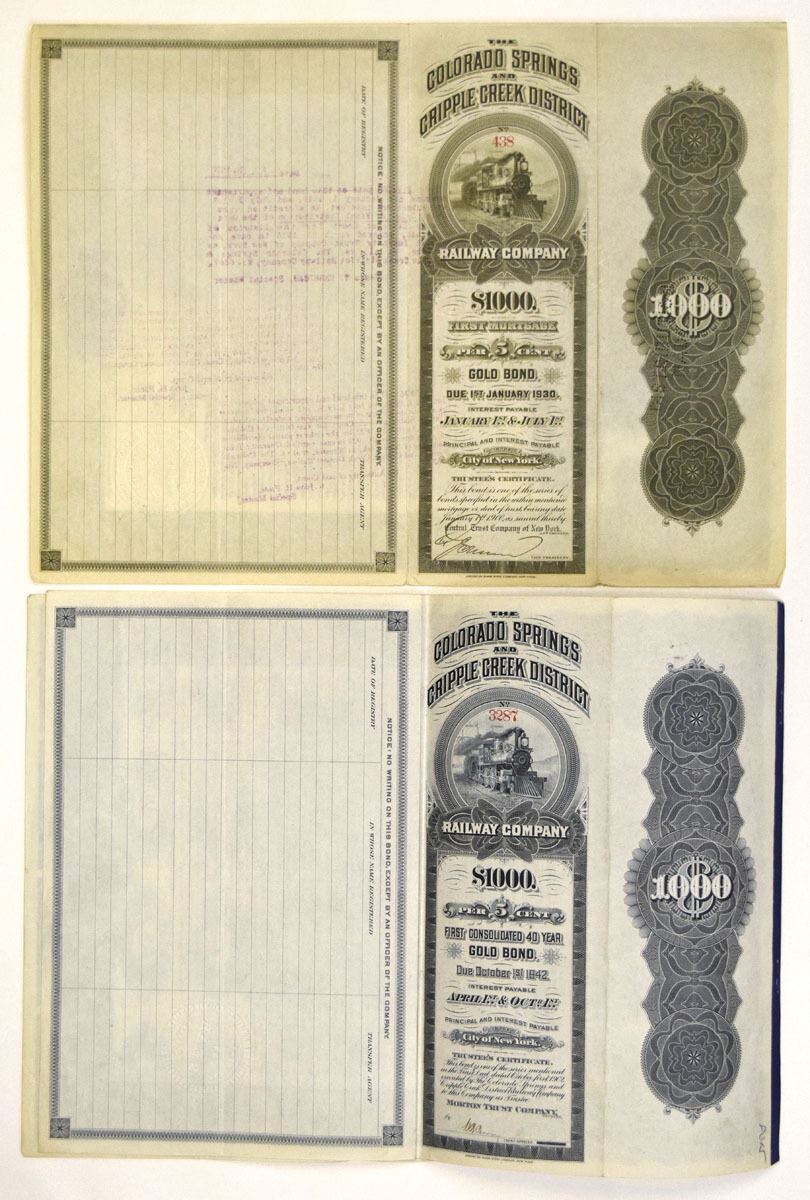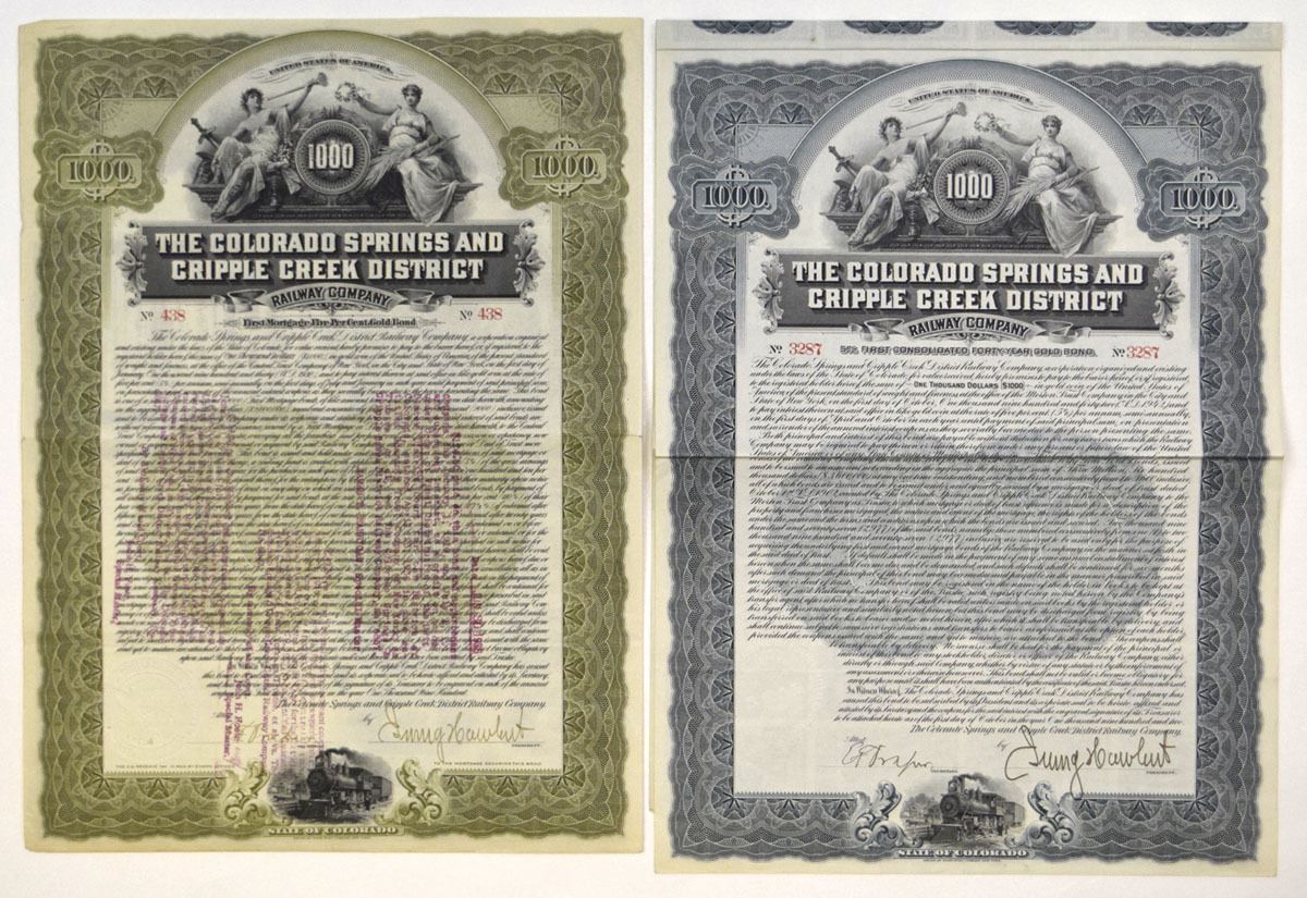Colorado....., 1900 and 1902. Lot of 2 I/C Bonds: 1900, $1000 5% First Mortgage Gold Coupon Bond with green border; and, 1902,, $1000 5% First Consolidated Fifty-Year Gold Coupon Bond with blue/gray border. Both have same vignette of allegorical women flanking denomination at top center. Bonds are in VF condition. ABNC. (2).