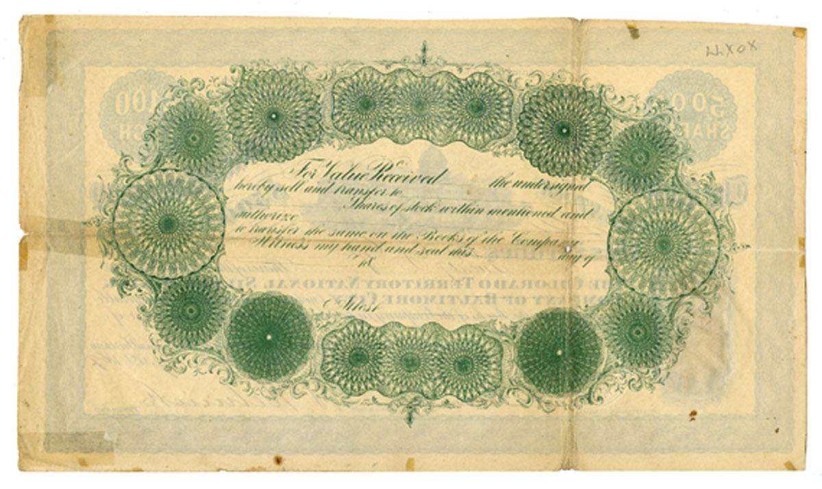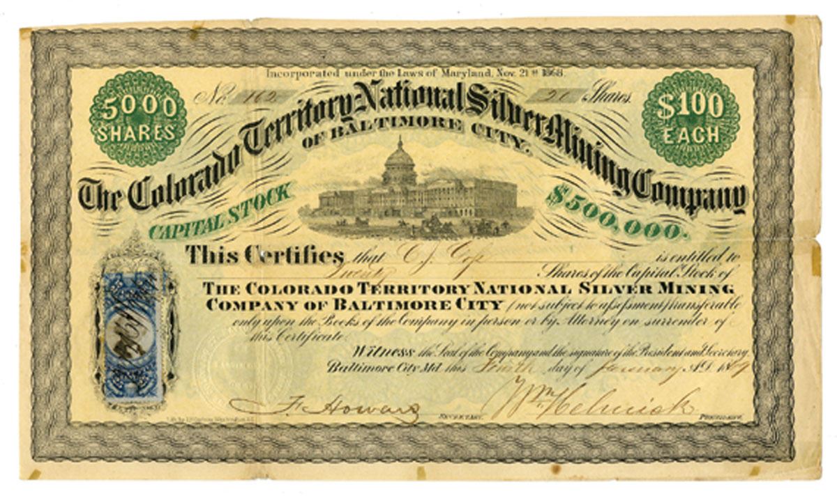 Colorado Territory, (Incorporated in Maryland), 1869. 20 Shares, I/U Capital Stock Certificate, Black and green print with black border, Capitol building in Washington at center below title, Blue revenue stamp at left, S/N 162, Fine to VF+ condition with archival reinforcement and stains. J. F. Gedney.