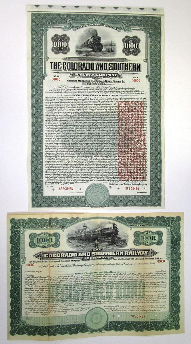 Colorado, 1905 and 1930, Lot of 2 Specimen Bonds, Includes: 1905, $1000 Registered 4 1/2% Refunding and Extension Mortgage Gold Bond, Black with green border, archival reinforcements on folds; 1930, $1000 4 1/2% Series A General Mortgage Gold Coupon Bond, Black with green border. Both have train at top center, Specimen overprints, POCs, range from Fine to XF condition, printed by ABNC. Attractive railroad bond pair.