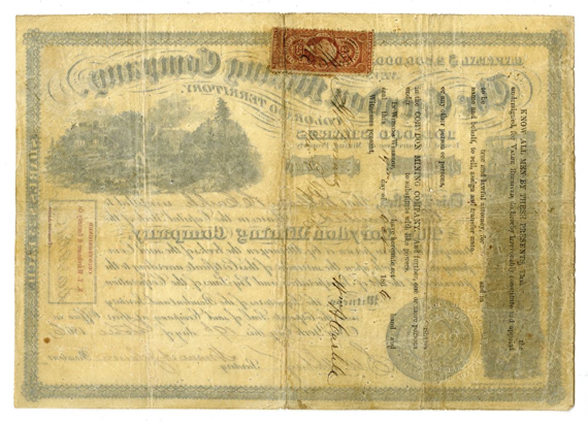 Nevada District...., Colorado Territory, (Incorporated in New York), 1866. 100 Shares I/U Stock Certificate, Black print with black border, Company title at top with mining vignette at right and along left side, 25 cent revenue stamp at left covering part of vignette, The company was tied to Nevadaville (Gregory Gulch), Gilpin County, in the Central City–Black Hawk district. Contemporary references place a “Corydon” mine/location in the Central City mining district. The company became notorious for market manipulation in New York/Boston. Newspapers in May to August 1867 reported the failure of a major “Corydon” stock operator (named John Leighton) and indicated the stock was to be stricken from the list over “swindling” by interested parties. S/N 734, VF to XF condition. Wm. H. Arthur.