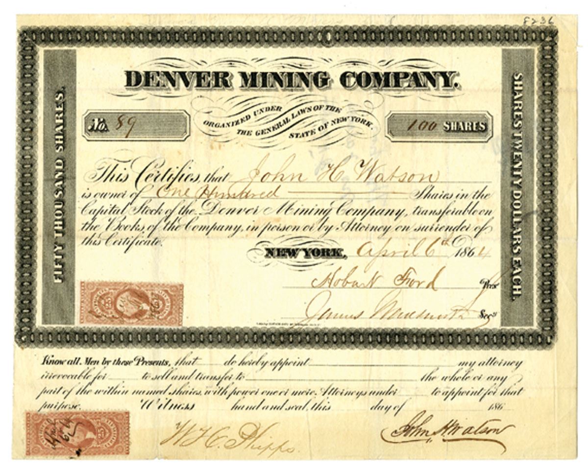 Colorado Territory...., New York, 1864. 100 Shares, I/U Capital Stock Certificate, Black print with black border, Company title at top without vignette, Two 25 Cents revenue stamps at left side, S/N 89; signed by Hobart Ford, President, and James Wadsworth, Secretary, the company controlled 400 feet on the Forks Lode in Nevada Gulch, Colorado, and the property was sold by the sheriff in 1866, VF to XF condition, Hatch & Co., James Hobart Ford served as a Union Army colonel (brevet brigadier general) during the American Civil War and played a significant role in the Trans-Mississippi Theater, including the Battle of Glorieta Pass and commanding the 2nd Colorado Cavalry Regiment. Rare and early Colorado mining stock certificate.